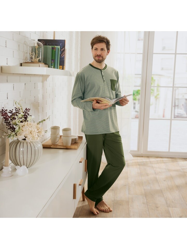 Мужская пижама Erwin Müller из одинарного джерси. Мужественный, яркий и спортивный шик. Топ выглядит очень повседневно с узкими трикотажными полосками, круглым вырезом, планкой на пуговицах и нагрудным карманом. Его легко комбинировать с простыми длинными брюками с широким притачным эластичным поясом и боковыми карманами. Непревзойденно удобная ночная рубашка обязана своим превосходным удобством ношения благодаря повседневному крою и мягкому, приятному для кожи качеству.
