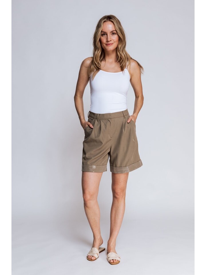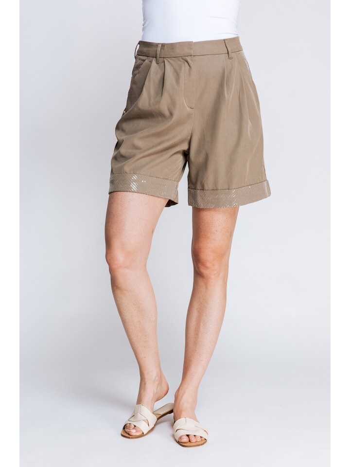 Откройте для себя стильные женские шорты Zhrill Fjella коричневого цвета — идеальное сочетание комфорта и элегантности. Эти модные шорты облегающего кроя впечатляют застежкой на крючок и молнию, а также практичными боковыми карманами. Однотонный образ подчеркивается тонкими аппликациями из пайеток, которые добавляют нотку гламура. Широкие штанины заканчиваются длиной до бедра, создавая повседневный, но шикарный образ. Высококачественный состав материала, состоящий из 70 % лиоцелла и 30 % полиэстера, гарантирует удобную посадку и долговечность.