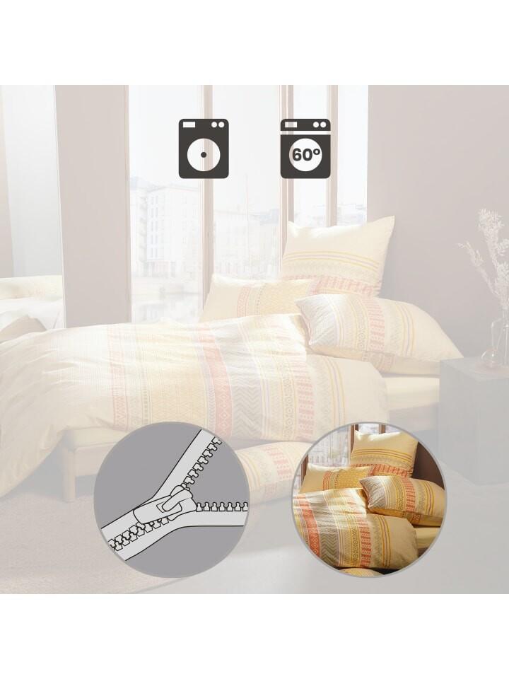 Постельное белье из хлопчатобумажной ткани Erwin Müller. Различные этнические узоры – иногда тонкие, а иногда цветные – покрывают очаровательную композицию и привносят глоток свежего воздуха в обстановку вашего сна. Двусторонняя наволочка придает ей еще большую индивидуальность. Особенно летом вас впечатлит приятное легкое, приятное для кожи, термобалансирующее качество с стойким эффектом крепирования. Он прост в использовании, быстро сохнет, не требует глажки и может быть быстро заменен благодаря застежке-молнии