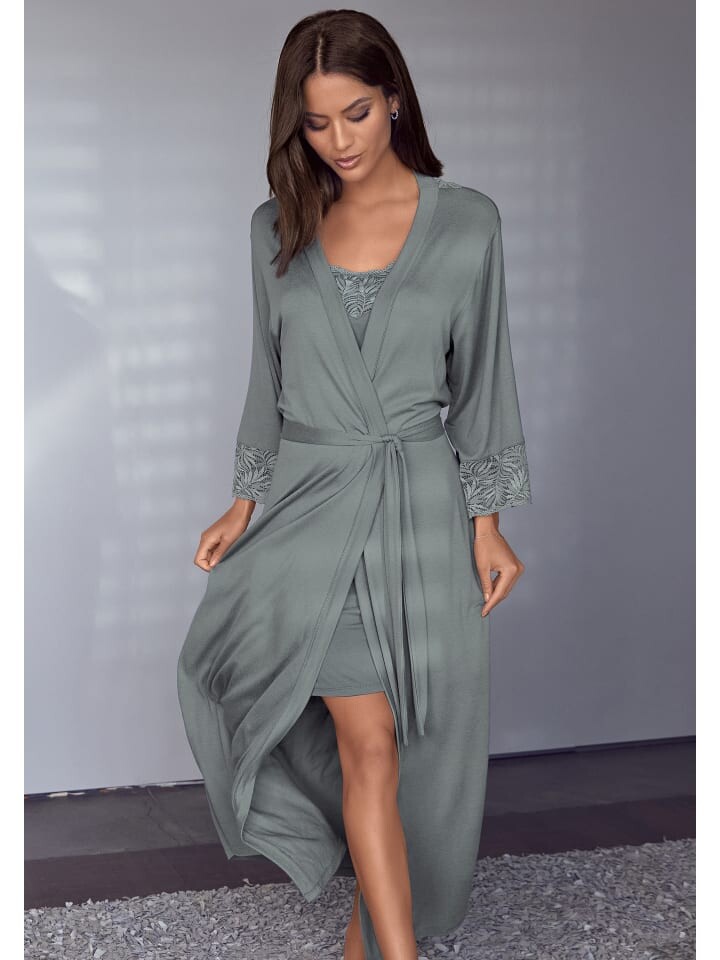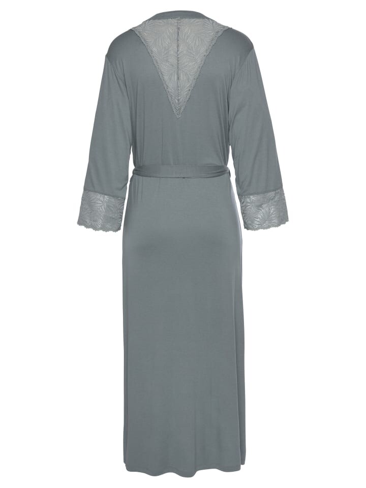 Элегантное длинное кимоно от Lascana. Однотонный цветной дизайн. Широкая кружевная отделка на концах длинных рукавов. Кружевная вставка сзади. Завязка на талии. Элегантный трикотаж высокого качества из 95% вискозы, 5% эластана. Кружево: 88% полиамид, 12% эластан.