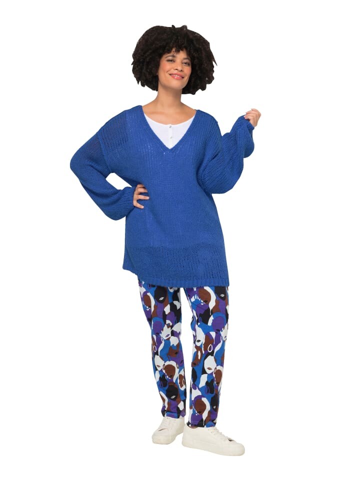 Пуловер оверсайз с характерными швами и широкими рукавами-фонариками. V-образный вырез.