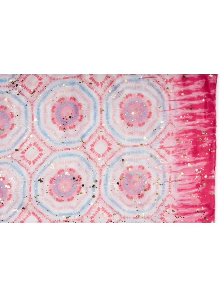 - Мягкий длинный шарф с короткой бахромой на концах из легкой ткани с узором мандалы в стиле батик и металлическими акцентами