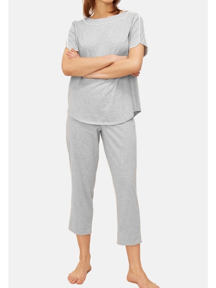 Пижама из рубашки с короткими рукавами и брюк длиной 7/8 с характерной окантовкой контрастного цвета. Верх имеет модный закругленный низ и искусно выполненные манжеты на рукавах. Брюки особенно удобны благодаря эластичному поясу. Мягкий интерлок из приятного для кожи хлопка.