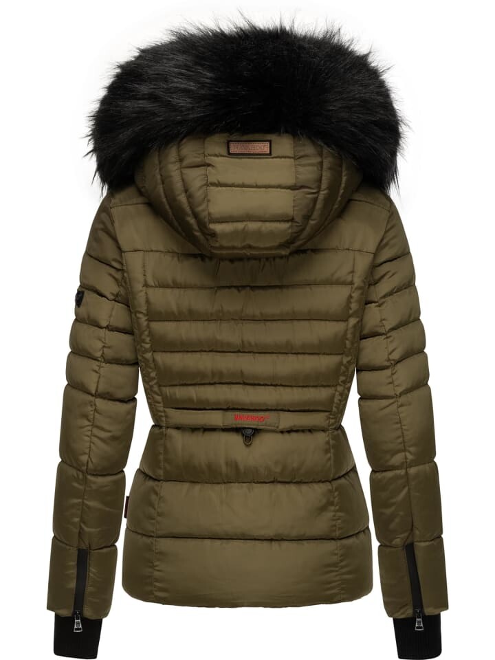 ВИД: Зимняя стеганая куртка с черным воротником из искусственного меха, слегка индивидуального кроя и элегантным матовым мерцающим внешним материалом - идеально подходит для зимы!