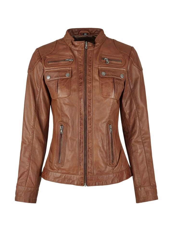 Эта спортивная женская кожаная куртка, облегающая фигуру, от 7eleven впечатляет своим стильным внешним видом. Он изготовлен из тонкой кожи ягненка наппа растительного дубления. Молодежный дизайн включает в себя воротник-стойку и множество повседневных деталей, таких как нашивки на плечах, нагрудные карманы с кнопками и четыре кармана на молнии. Номер модели:SEL-Performance7E