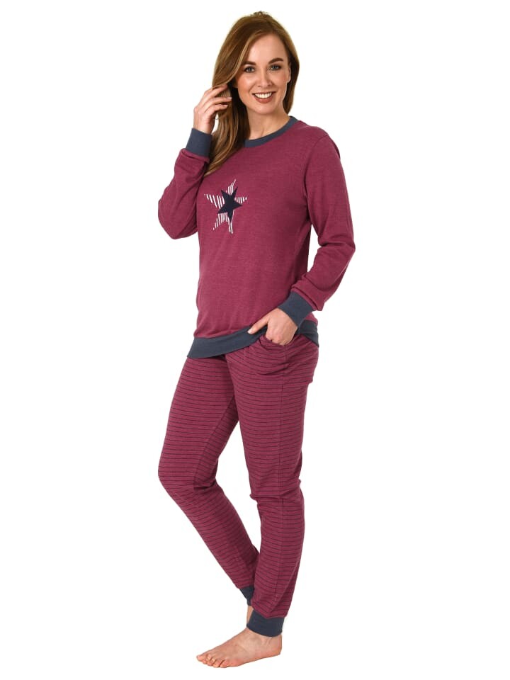 Когда наступит более холодное и прохладное время года, а ночи снова станут длиннее, кому не хотелось бы иметь уютную и теплую пижаму, которая к тому же хороша и выглядит прохладно? Тогда эта пижама идеально вам подойдет, ведь эти женские пижамы уютного качества интерлок имеют великолепный и элегантный вид, а также уютны, теплы и мягки. Верх пижамы имеет манжеты и звезду в качестве мотива, штаны пижамы полосатые и также имеют манжеты.