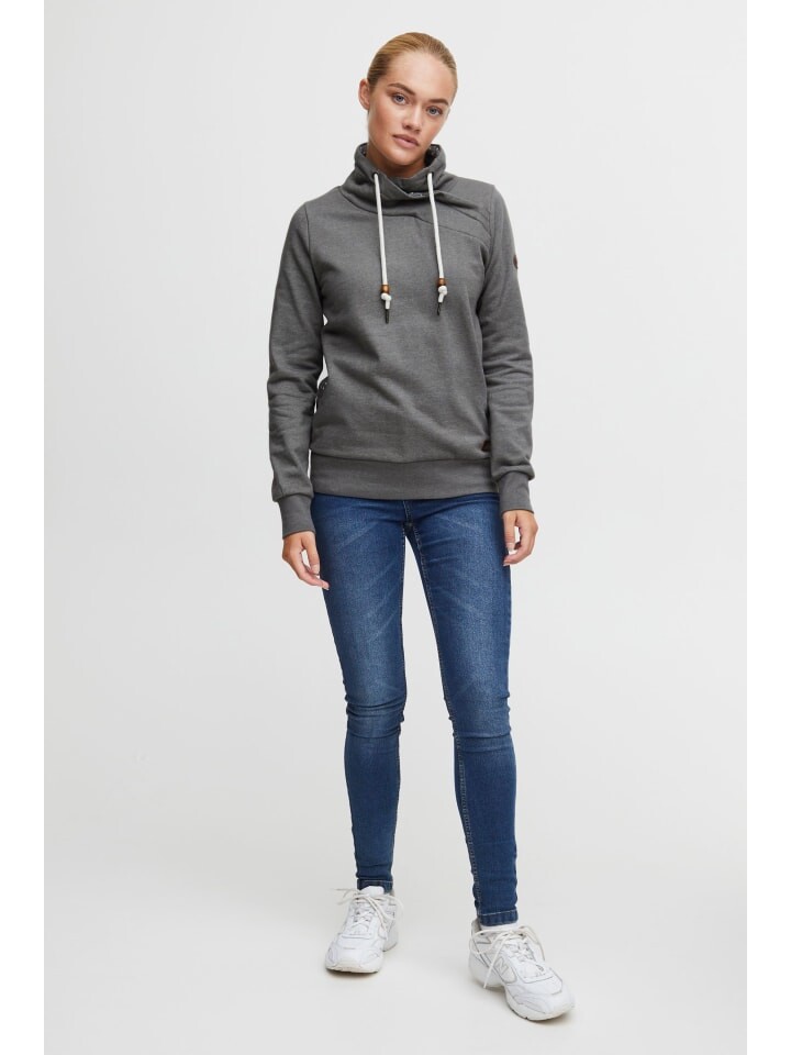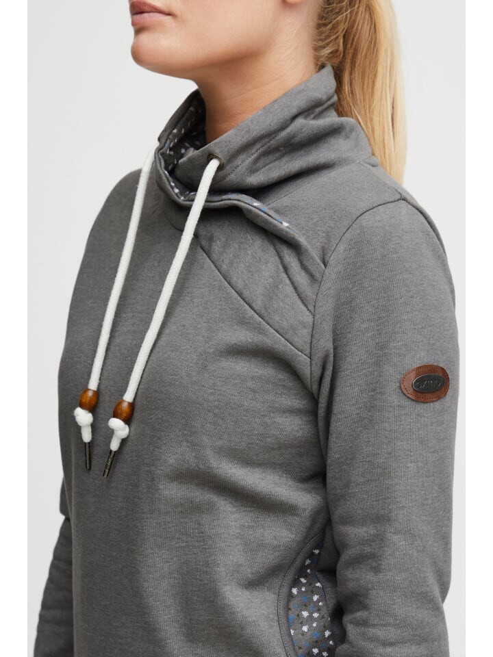 ДЕТАЛИ И ОСОБЕННОСТИ: Женская толстовка с воротником-стойкой, боковыми, слегка закругленными карманами, логотипом из искусственной кожи над нижним краем, эластичными трикотажными манжетами на рукавах и подоле, кулиской на воротнике-стойке с декоративными деревянными деталями, цветочным принтом. подкладка на воротнике и карманах, значок с логотипом на плече, стандартный крой