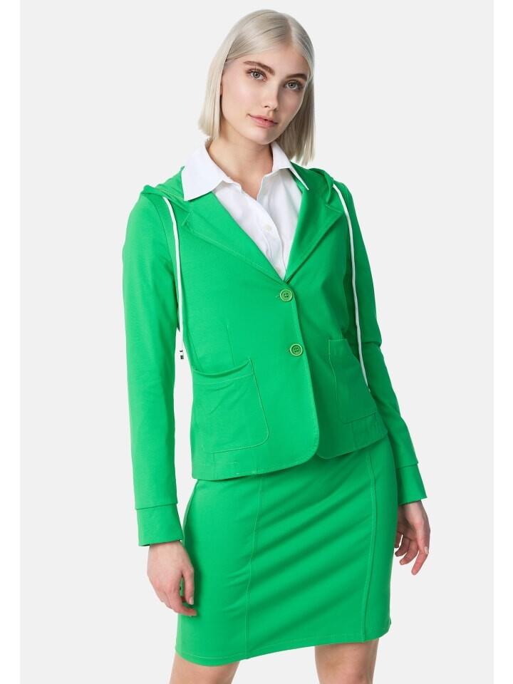 Универсальный женский пиджак с капюшоном, изготовленный из 53% высококачественной вискозы, яркого дизайна. Особое сочетание пиджака и худи для создания экстравагантного и комфортного образа. Модный женский пиджак-худи, идеально сочетающий в себе комфорт и стиль. Модный пиджак с капюшоном – это идеальное сочетание классического женского пиджака и повседневного образа худи. Женский пиджак выполнен в классическом стиле с узким воротником с лацканами, переходящим в капюшон. Капюшон оснащен кулиской с белыми шнурами с металлическими манжетами для регулировки. Пиджак застегивается спереди на две большие пуговицы в тон. Два накладных передних кармана создают достаточно места для хранения вещей и подчеркивают стиль делового пиджака. Рукава свободного покроя заканчиваются поясом. Передняя часть имеет закругленные края.