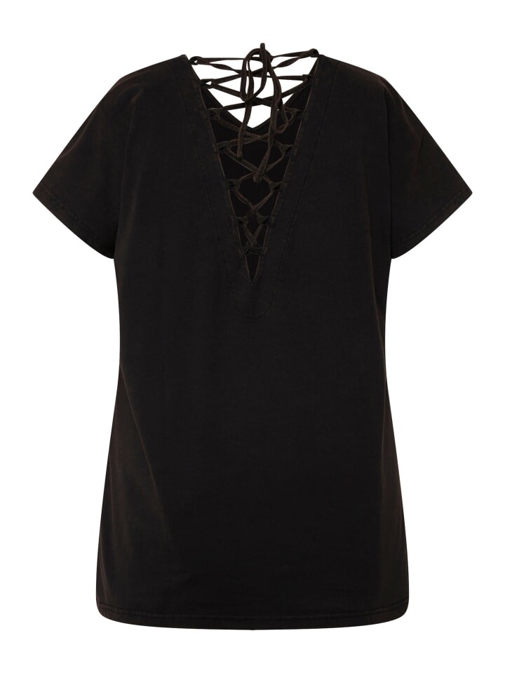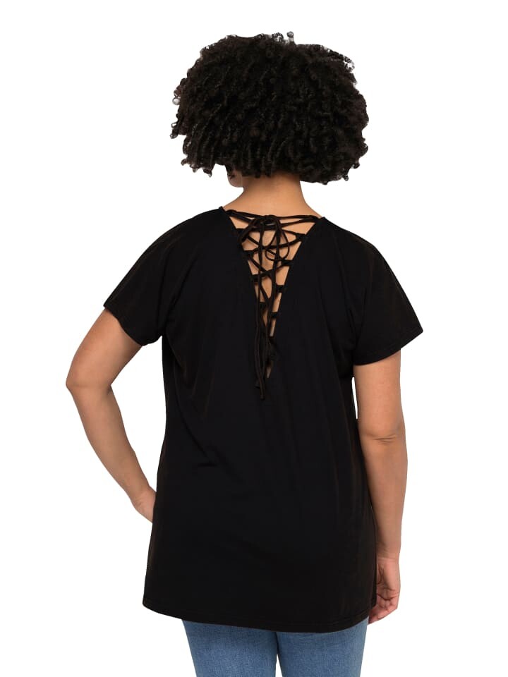 Футболка оверсайз из мягкого трикотажа с сексуальными декоративными лентами сзади. V-образный вырез, заниженная линия плеча, полурукава.