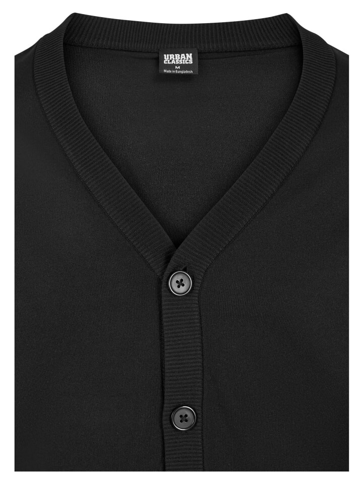 Легкая мужская куртка классического фасона с глубоким V-образным вырезом и планкой с пятью большими пуговицами. Также имеются два накладных боковых кармана. Образ дополняет тонкая ребристая вязка на планке с пуговицами, по краю и на манжетах. Образ повседневный благодаря удобному свободному крою с перекрытием плеч. Мужской кардиган изготовлен из полиамида.