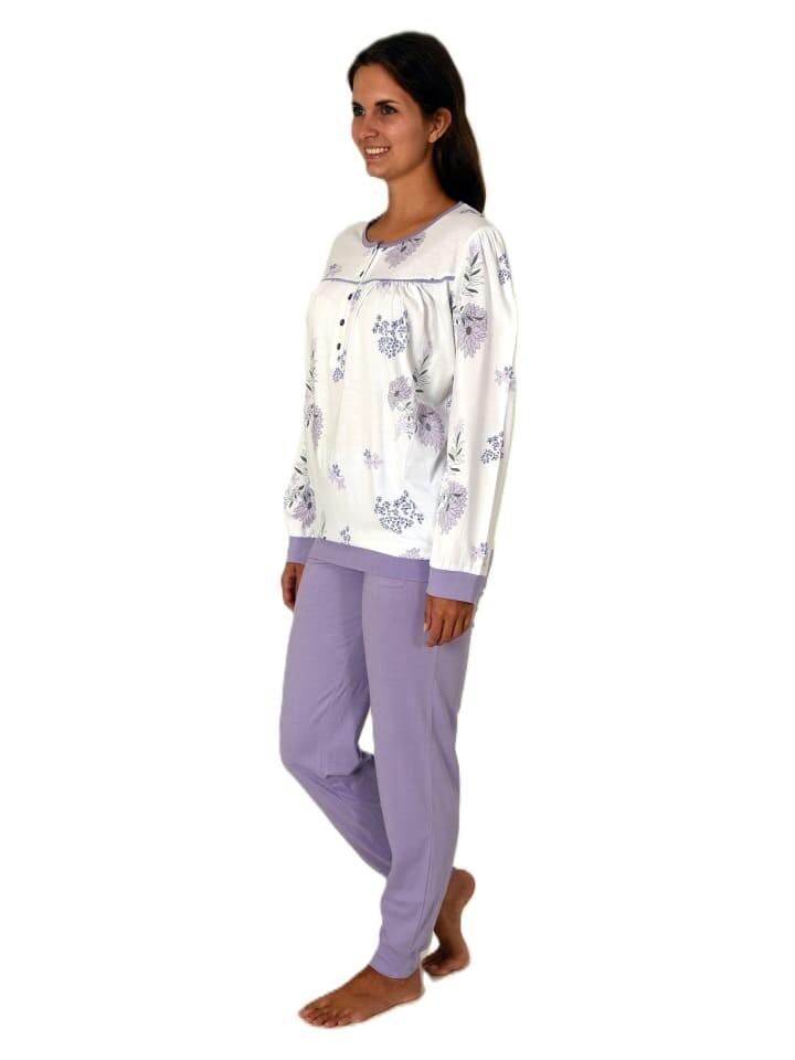 Женственная пижама с длинными рукавами и манжетами классического вида. Эти женские пижамы от Normann просто классически элегантны и неподвластны времени. Верх пижамы выполнен в цветочном дизайне, имеет манжеты и планку с пуговицами на вырезе, однотонные пижамные штаны из эластичного трикотажа также имеют манжеты, а цвет идеально сочетается с верхом пижамы.