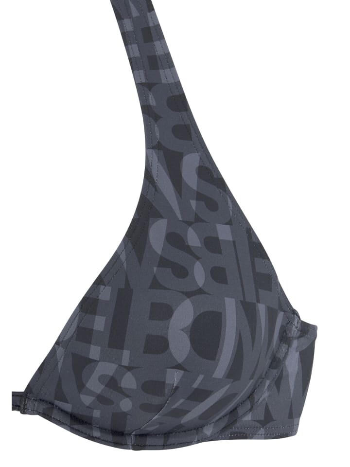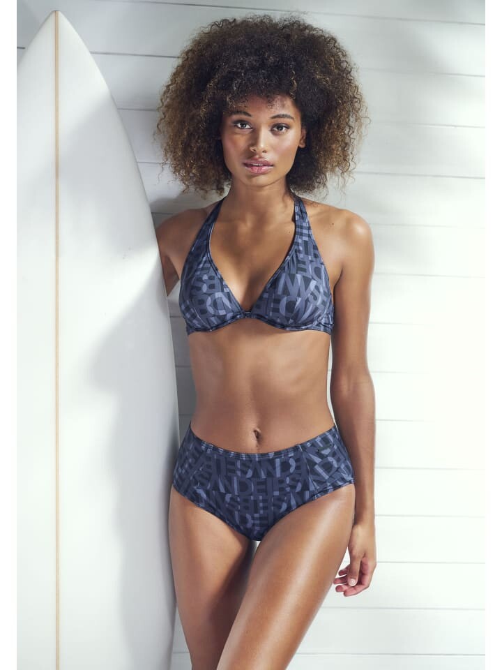 Лиф бикини на косточках от Elbsand с модным брендовым принтом по всей поверхности. Чашечки с формирующими косточками и съемными вставками. Широкое ожерелье для завязывания. Из серии Микс-Кини. Переработанная микрофибра.