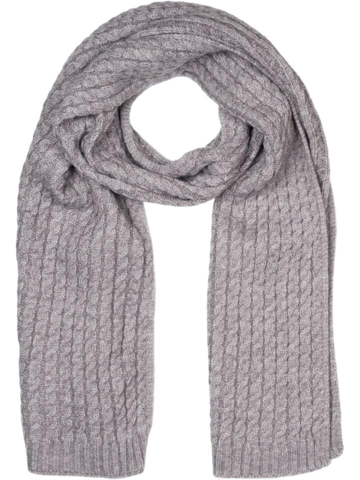 - Классический длинный теплый шарф косой вязки, шапка с помпоном из искусственного меха и вязаные перчатки в тон