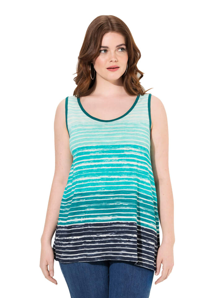 Топ А-силуэта без рукавов с градиентными полосками. Круглая горловина, приятные широкие бретели. Внешний материал: 100% хлопок.