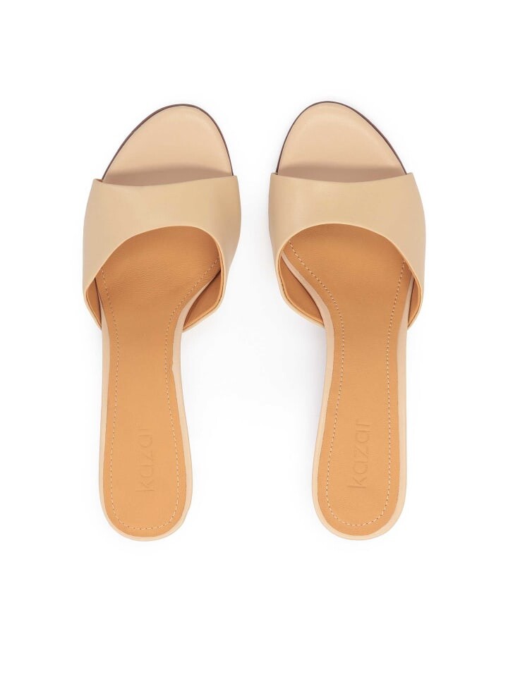 Мюли из высококачественной зерненой кожи нейтрального бежевого тона станут чрезвычайно женственным, утонченным и неподвластным времени дополнением ко многим нарядам. Простой ремешок спереди, высокий каблук и гладкая кожа создают шикарную композицию. Мюли на высоком каблуке — интересная альтернатива классическим сандалиям и туфлям.