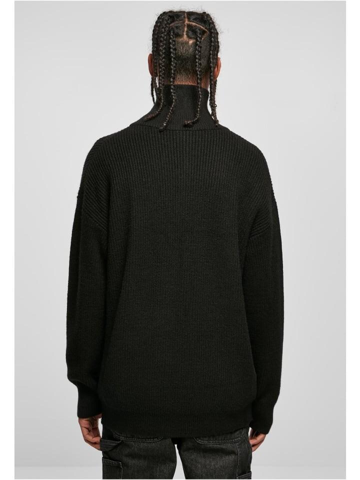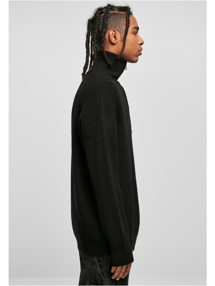 Мужской вязаный свитер впечатляет высоким воротником-стойкой на металлической молнии и длинным вырезом на молнии. Его образ продолжает широкий ребристый трикотаж из вискозы, полиэстера и нейлона, а объемный крой со спущенными плечами и широкими ребристыми манжетами и подолом.