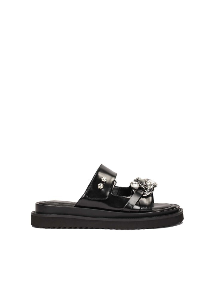 Черные мюли на прямой подошве из качественной лицевой кожи – идеальное предложение для женщин, которые ценят комфорт и модный образ. Широкие бретели, украшенные металлической цепочкой и крупными блестящими фианитами, будут эффектно смотреться на солнце. Представленные здесь мюли идеально подходят в качестве дополнения к летнему повседневному образу.