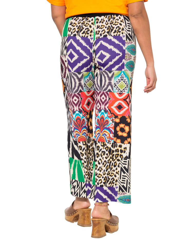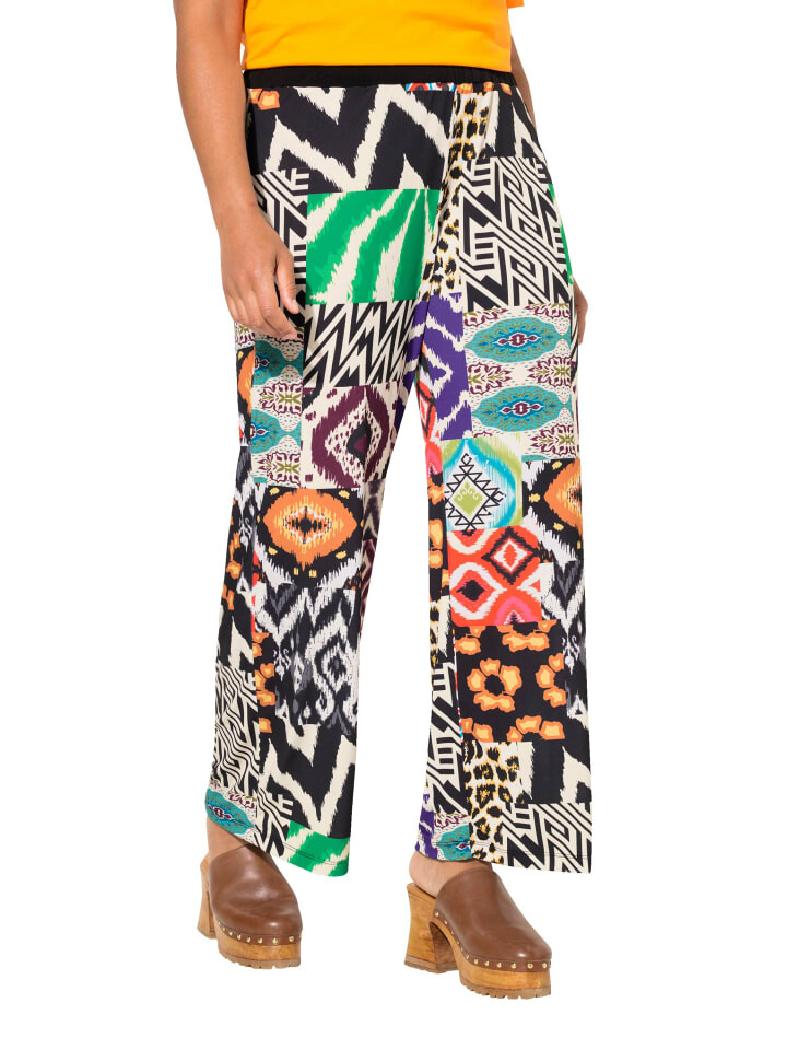 Брюки, широкие штанины, с принтом по всей поверхности и эластичным поясом.
