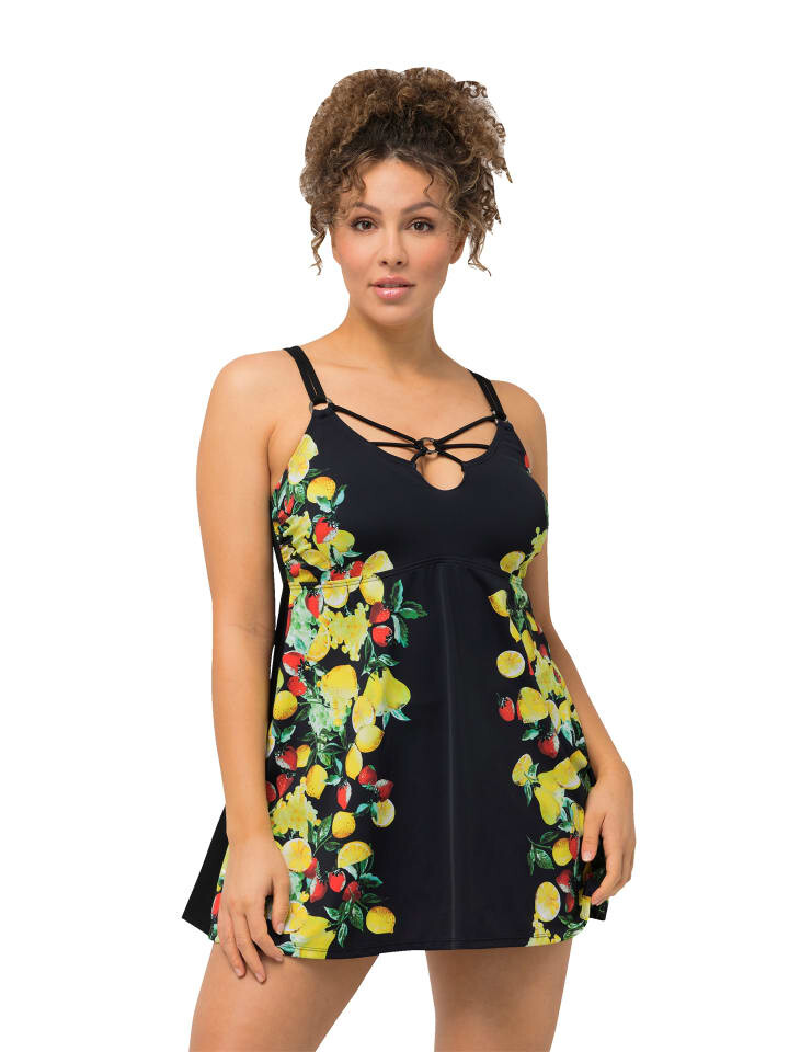 Купальное платье с мягкими чашками и поддерживающими косточками, лимонным принтом сбоку и встроенным купальником. Бюст с декоративными лентами и кольцами. Полоса под грудью. Передняя подкладка. Изготовлено из переработанного полиэстера.