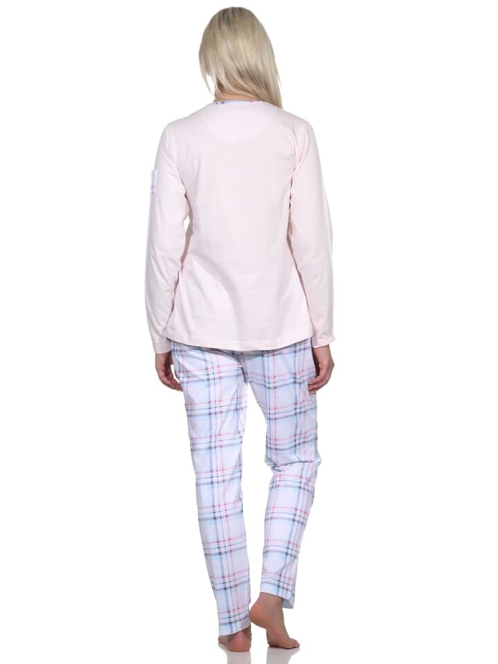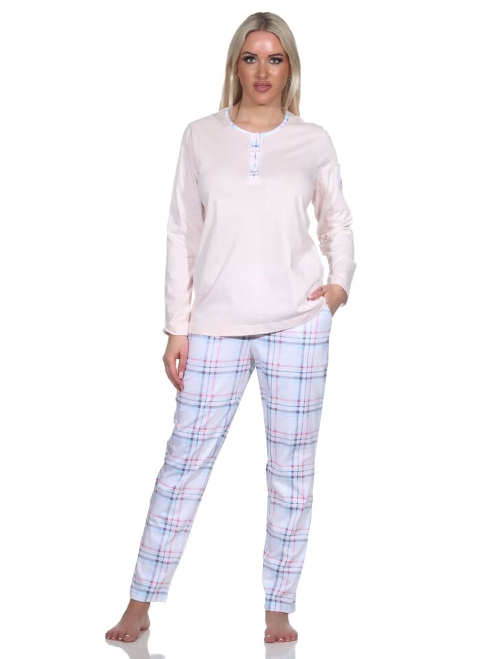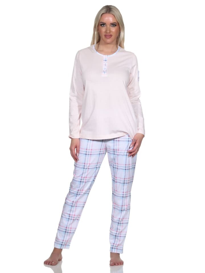 В этой пижаме всегда хорошо выглядеть! Эти женские пижамы впечатляют своим элегантным видом. Верх пижамы однотонный, имеет планку с пуговицами на горловине и небольшой карман на рукаве, брюки пижамы в клетку выполнены из мягкого и эластичного одинарного трикотажа.