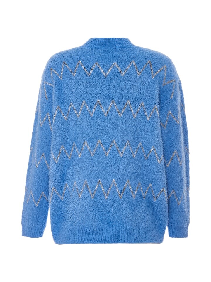 Вязаный свитер от ebeeza из смеси ворсованной пряжи имеет слегка ворсистый вид и захватывающий зигзагообразный узор из пряжи с золотистым эффектом. В дополнение к классической форме он отличается обрезанными плечами и завершающими ребристыми манжетами.