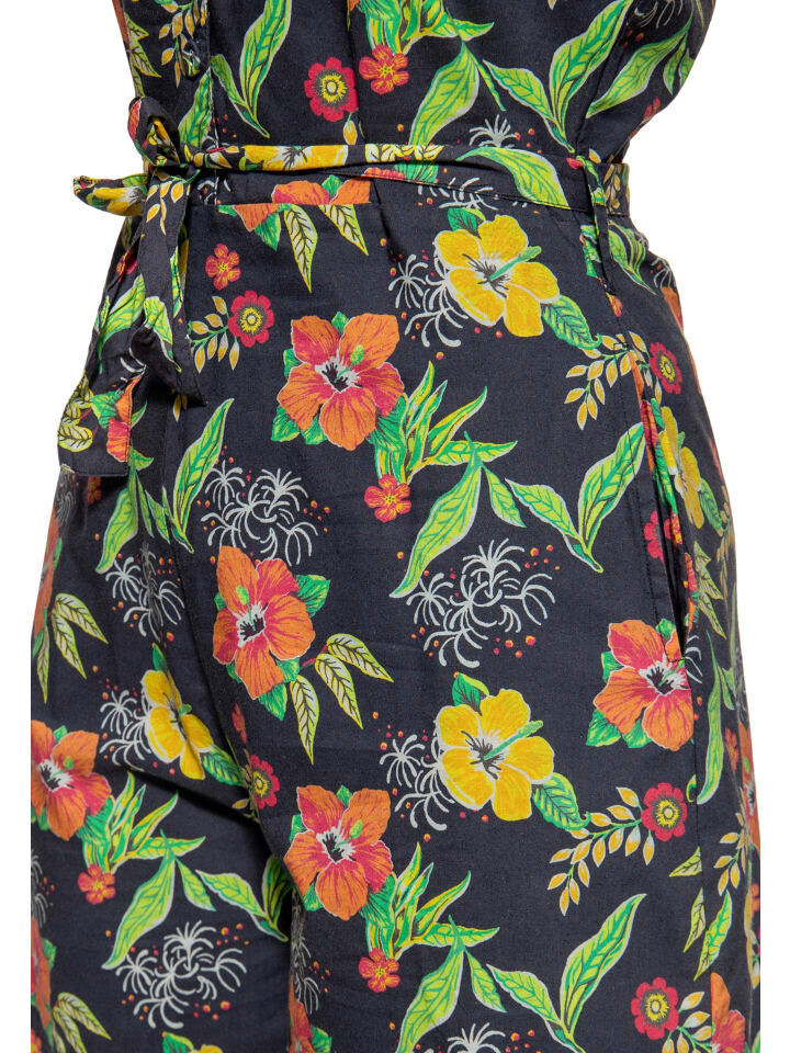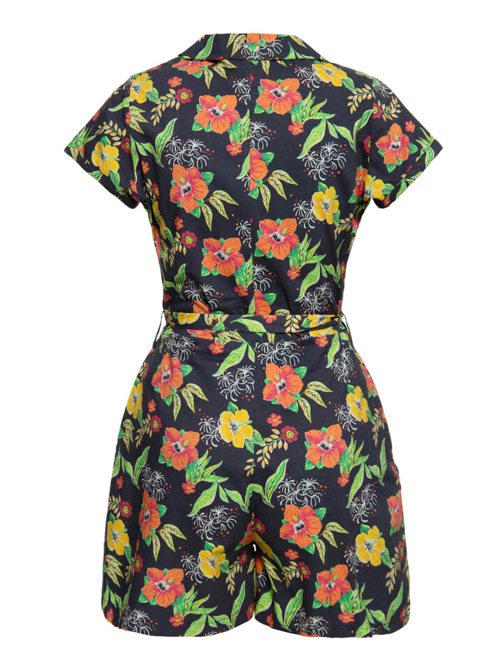 Гавайские летние мечты! В этом коротком комбинезоне-блузке в стиле 50-х от Queen Kerosin вы окунетесь в чистое летнее настроение. Стильный повседневный блузон с воротником с лацканами и планкой на пуговицах в сочетании с подчеркивающим фигуру кроем создают сказочный женственный летний силуэт. Съемный поясной ремень, который при желании можно завязать бантом, добавляет игривый акцент. В боковых карманах можно хранить все необходимое, например губную помаду и т. д. Яркий контрастный узор тропического гавайского гибискуса идеально дополняет винтажный образ. Непрозрачная высококачественная смесь хлопка и вискозы придает коже ощущение воздушности и комфорта даже в жаркие дни. Комбинируя непринужденную атмосферу с кроссовками или сексуальный шик с туфлями, в этом летнем образе вы сможете в кратчайшие сроки создать удачный наряд для любого случая!