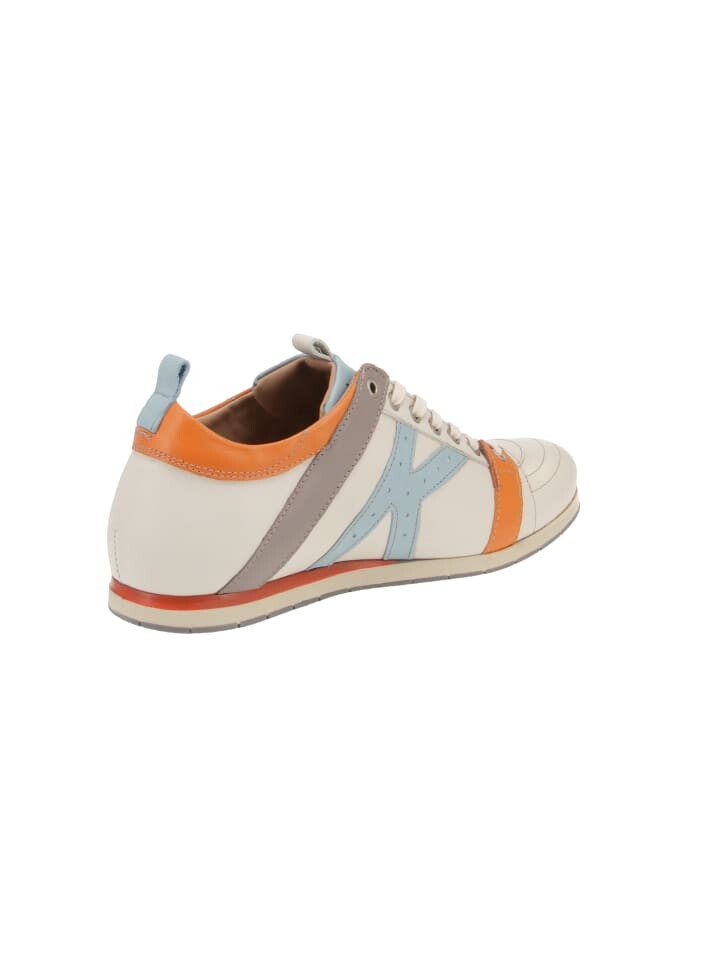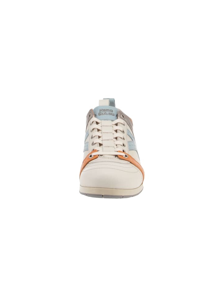 Верх из высококачественной кожи в оптимально подобранном цветовом сочетании делает эти мужские кроссовки ручной работы от бренда Kamo-Gutsu настоящим хитом весны и лета. Кожаная стелька съемная и легко заменяется. В комплект также входят модные альтернативные шнурки оранжевого цвета.