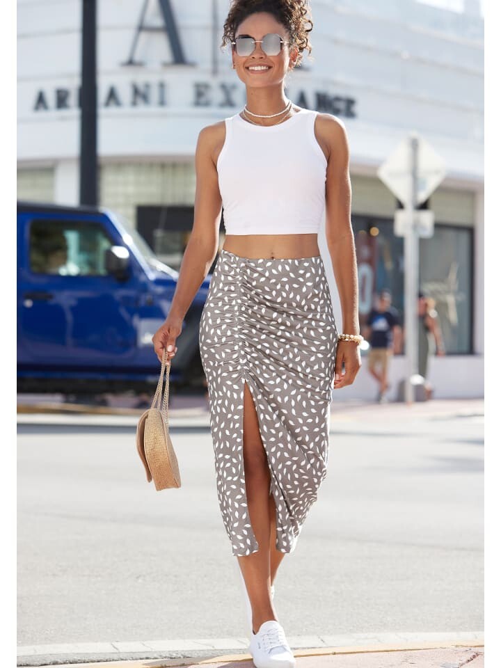 Юбка миди от Vivance. С принтом по всей поверхности. Присборки по бокам и разрезы по краю. Пояс с внутренней резинкой. Хороший комбинированный партнер. Из мягкого трикотажа.