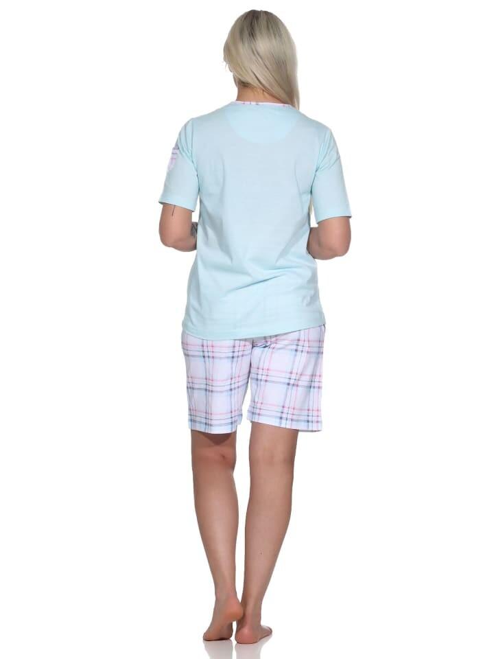 Эти короткие пижамы с короткими рукавами всегда хорошо одеты! Эти летние женские короткие пижамы впечатляют своим элегантным видом. Верх пижамы с короткими рукавами однотонный, имеет планку с пуговицами на горловине и небольшой карман на рукаве, шорты пижамы в клетку выполнены из мягкого и эластичного одинарного трикотажа.