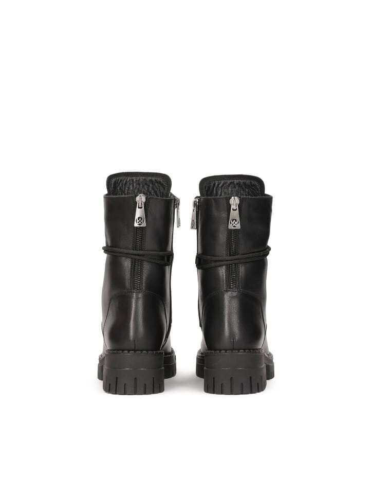 Сапоги простого дизайна изготовлены из натуральной кожи, что повышает их долговечность и эстетическую ценность. Голенище длиной до щиколотки имеет молнию для удобства надевания, низкую шнуровку и декоративную молнию сзади. Простые ботинки на толстой подошве идеально подходят для различных условий осенне-зимнего сезона.