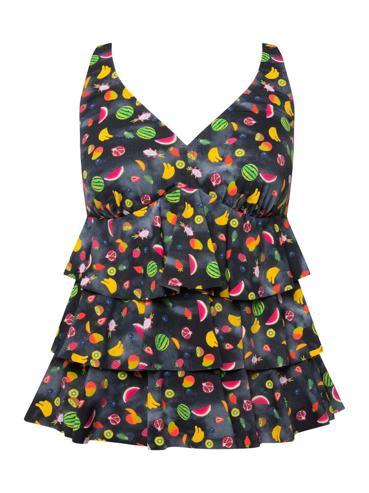 Танкини, костюм-двойка с мягкими чашками и принтом тутти-фрутти. Удлиненный топ с модными воланами. V-образный вырез, широкие бретели, пояс под грудью, подкладка спереди. Трусы-универы. Изготовлено из переработанного полиамида.