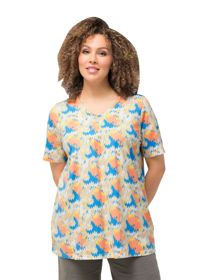 Футболка А-силуэта с графическим принтом. V-образный вырез с 3 декоративными складками, полурукава.