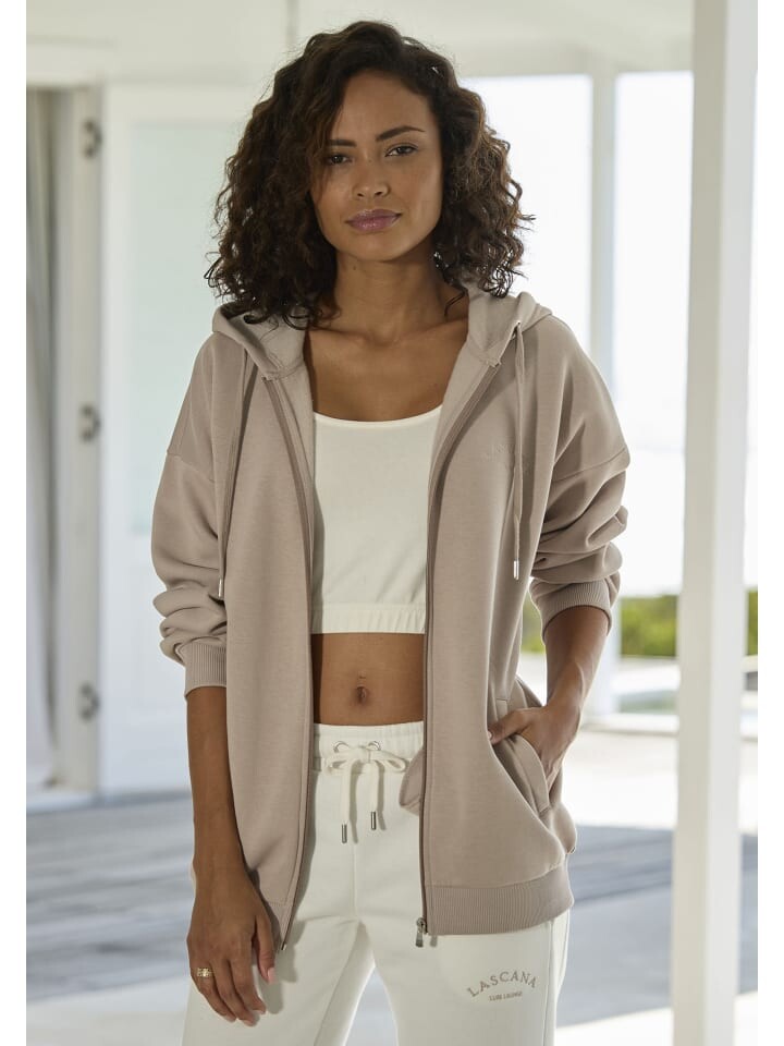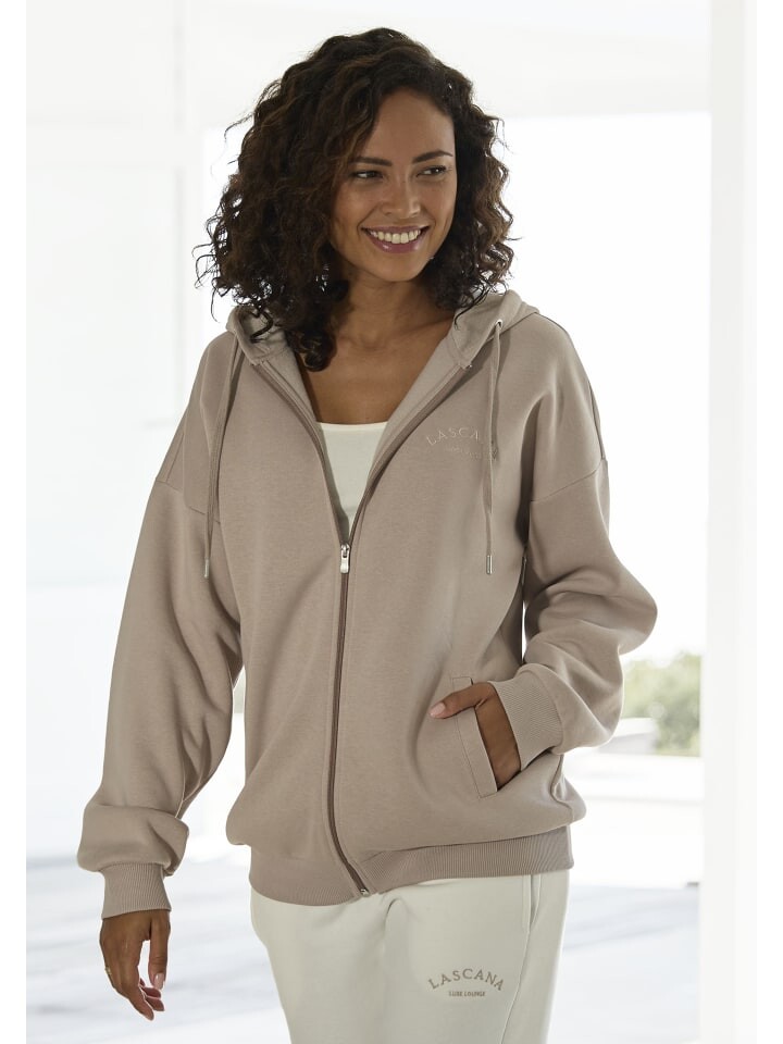 Толстовка с капюшоном от Lascana. Однотонный цветной дизайн. Капюшон на шнурке. Боковые карманы. Небольшой логотип на груди. Ребристые манжеты. Мягкий спортивный костюм.