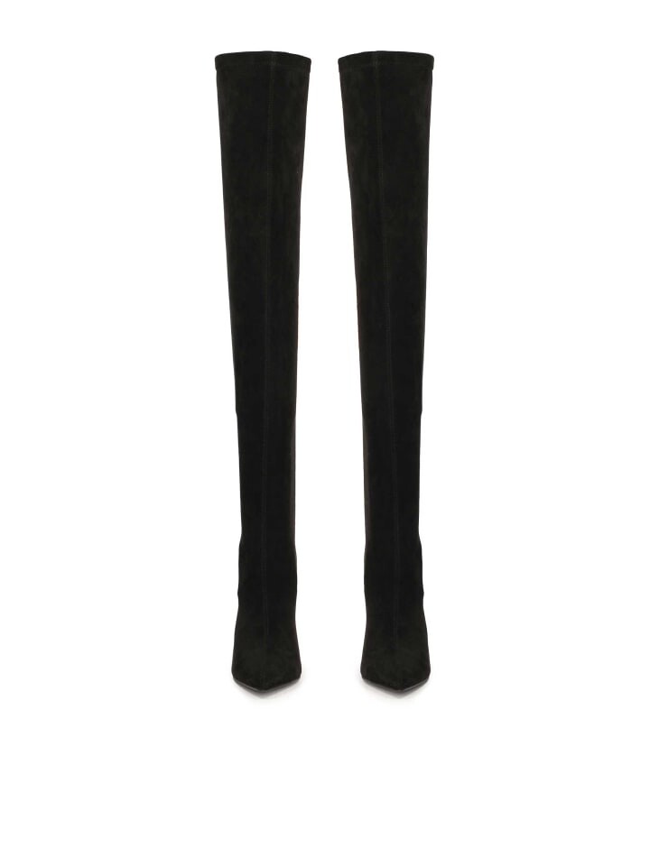 Черные ботфорты с высоким голенищем и тонким каблуком – классическая и вневременная модель, которая выглядит очень женственно и сексуально. Верх из высококачественной ткани без застежки подчеркивает узкий крой. Заостренный носок и узкий высокий каблук красиво приподнимают силуэт и делают ногу длиннее и стройнее.