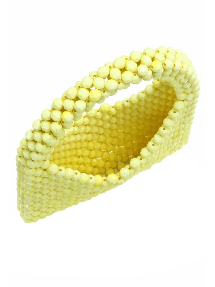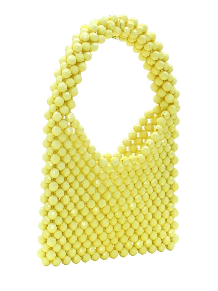Эта сумка из бисера изысканного дизайна представляет собой плотный массив сферических бусин, тщательно собранных в текстурированную поверхность. Изогнутая ручка плавно интегрируется в корпус и сохраняет один и тот же замысловатый узор из бисера по всей длине.