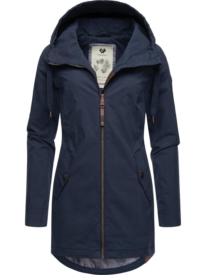 ВИД: Стильная, легкая женская куртка для активного отдыха с капюшоном на подкладке и толстыми шнурками на кулиске от модного лейбла уличной одежды Ragwear, 100% веганское производство. МАТЕРИАЛ: Куртка с капюшоном из прочной смеси хлопка и гладкой бархатистой внутренней подкладкой с цветочным принтом; Легкая куртка обеспечивает высокий уровень комфорта, не в последнюю очередь благодаря небольшому весу. Посадка: идеальная длина по ягодицам, слегка индивидуальный крой, подчеркнутый оборками на спине, сзади немного длиннее, чем спереди, практичность. кулиска на подоле куртки служит защитой от ветра