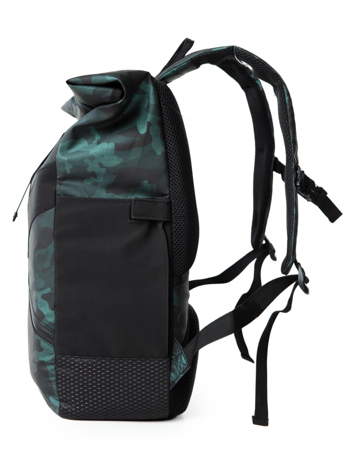 Велокурьерский рюкзак в камуфляже (60 х 27 х 13 см, 0,7 кг, 21 литр). Ролл-топ регулирует громкость. Мягкий карман на молнии для ноутбука/планшета (снаружи, не соединен с основным отделением). Светоотражающий материал поверхности из ПУ с камуфляжным рисунком (со светоотражающим эффектом) для безопасной езды на велосипеде в ночное время. Устойчивый к сжатию, царапинам, разрыву и истиранию материал из 50 % полиэстера + 50 % ПУ, впитывающий влагу. Набивка спины из трех частей MESH (бедра + лопатка), мягкие лямки MESH (регулируемая длина, дышащие). Регулируемый по длине нагрудный ремень с застежкой-клипсой.