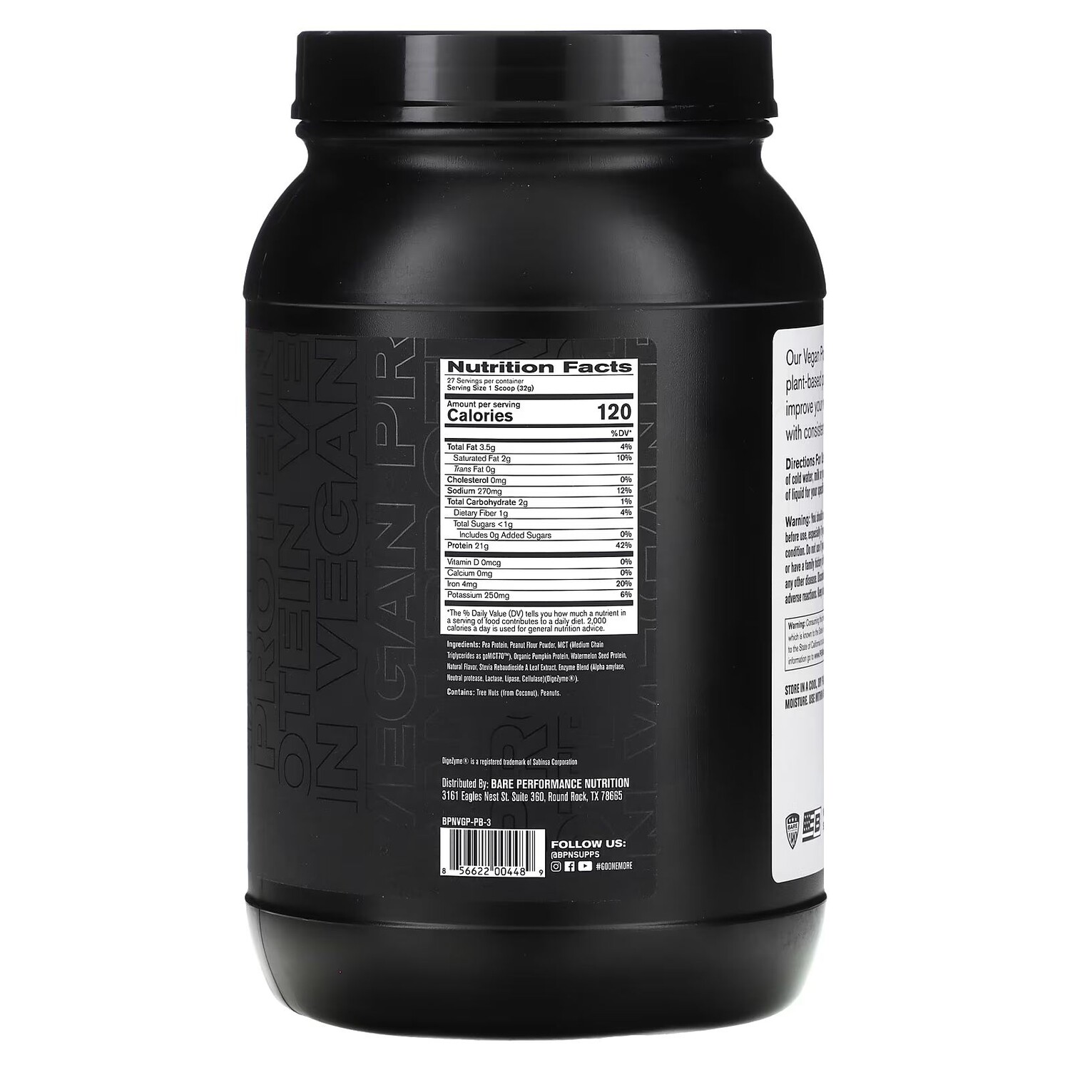 Гороховый протеин, порошок из арахисовой муки, mct (среднецепочечные триглицериды в виде gomct70 ), органический тыквенный протеин, протеин из семян арбуза, натурального ароматизатора, стевия ребаудиозид экстракт листьев, смесь ферментов (альфа-амилаза, нейтральная протеаза, лактаза, липаза, целлюлаза) (Digezyme).