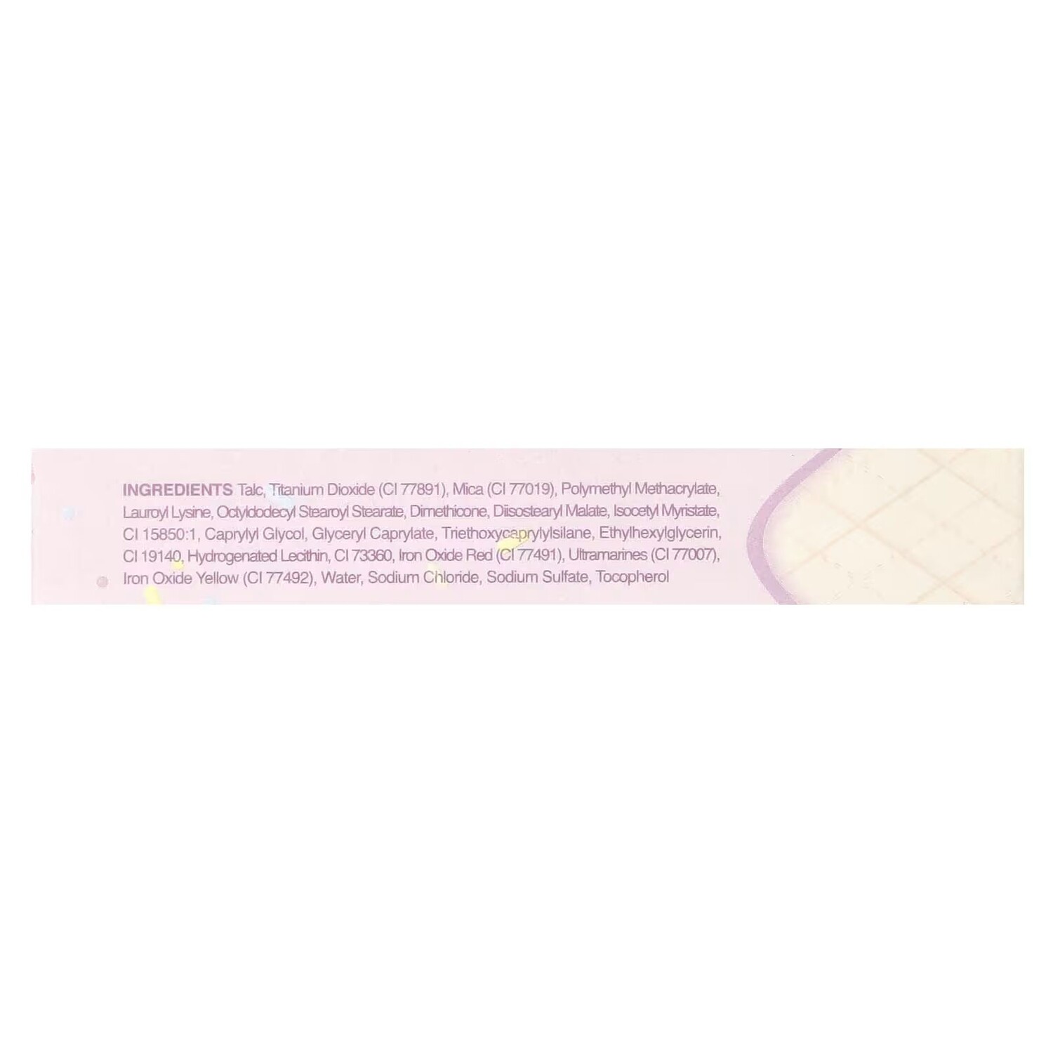 Фиолетовая ягода: Тальк, слюда (CI 77019), диоксид титана (CI 77891), полиметилметакрилат, лауроил лизин, диметикон, октилдодецил стеароил стеарат, CI 15850: 1, диизостеарил малат, изоцетил миристат, каприлил гликоль, CI 19140, глицерил каприлат, этилгексилглицерин, триэтоксикаприлилсилан, гидрогенизированный лецитин,