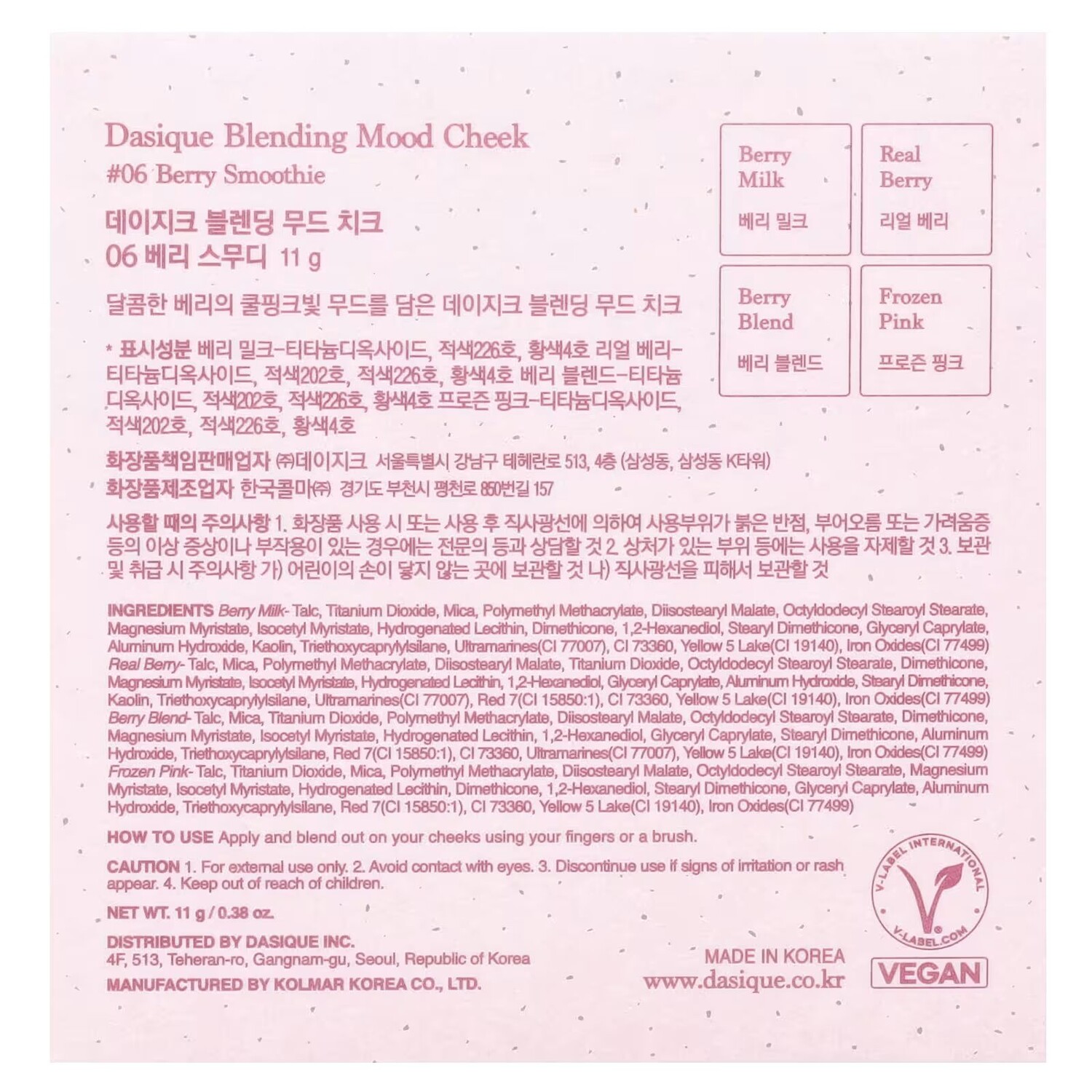 Ягодная смесь - тальк, слюда, диоксид титана, полиметилметакрилат, диизостеарил малат, октилдодецил стеароил стеарат, диметикон, миристат магния, изоцетил миристат, гидрогенизированный лецитин, 1,2-гександиол, глицерил каприлат, стеарил диметикон, гидроксид алюминия, триэтоксикаприлилсилан, красный 7 (CI 15850: 1), CI 73360, ультрамарины (CI 77007), желтое 5 озеро (CI 19140), оксиды железа (CI 77499).