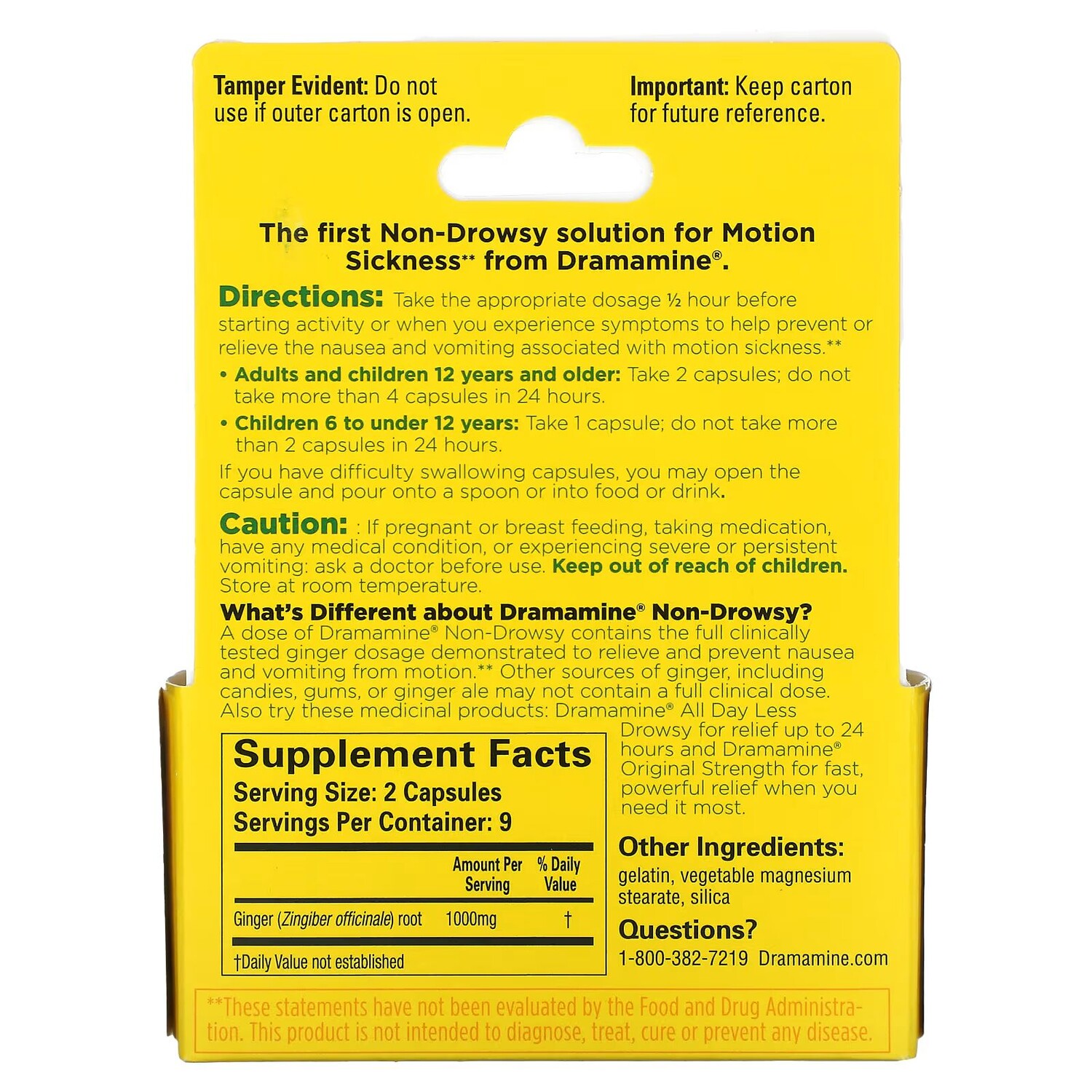 Одна доза Dramamine Non-Drowsy содержит полную клинически протестированную дозировку имбиря, которая облегчает и предотвращает тошноту и рвоту от движения. Другие источники имбиря, включая конфеты, жевательные мармеладки или имбирный эль, могут не содержать полную клиническую дозу.