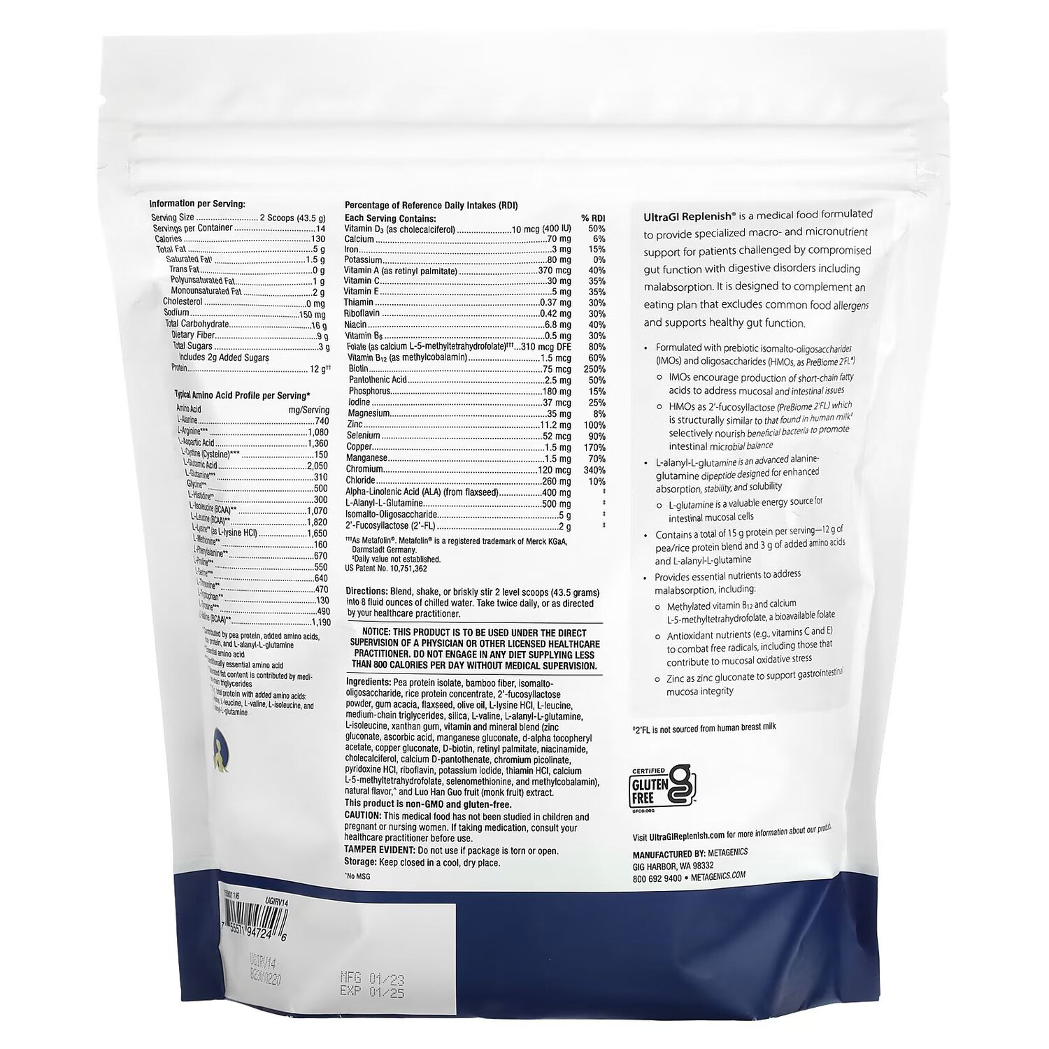 UltraGl Replenish - это медицинская пища, разработанная для обеспечения специализированной макро- и микронутриентной поддержки для пациентов с нарушенной функцией кишечника с нарушениями пищеварения, включая мальабсорбцию. Он разработан в качестве дополнения к рациону, исключающему распространенные пищевые аллергены и поддерживающему здоровую работу кишечника.