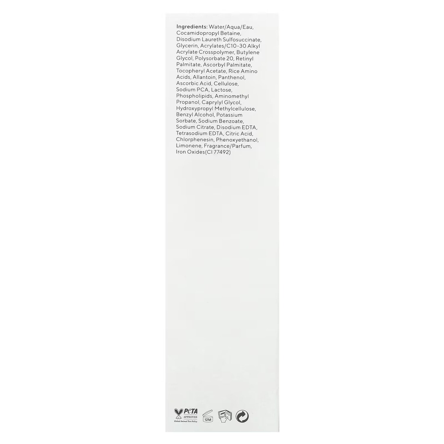 Вода (eau), кокамидопропилбетаин, динатрия лаурет сульфосукцинат, глицерин, акрилат/c10-30 алкил акрилат кроссполимер, бутиленгликоль, полисорбат 20, ретинилпальмитат, аскорбил пальмитат, токоферилацетат, аминокислоты риса, аллантоин, пантенол, аскорбиновая кислота, целлюлоза, натрия пирролидонкарбонат, лактоза, фосфолипидов, аминометил пропанол, каприлилгликоль, гидроксипропилметилцеллюлоза, бензиловый спирт, сорбат калия, бензоат натрия, цитрат натрия, двунатриевая ЭДТК, тетранатрия ЭДТК, лимонная кислота, хлорфенезин, феноксиэтанол, лимонена, отдушка (парфюмерная композиция), оксиды железа (CI 77492).