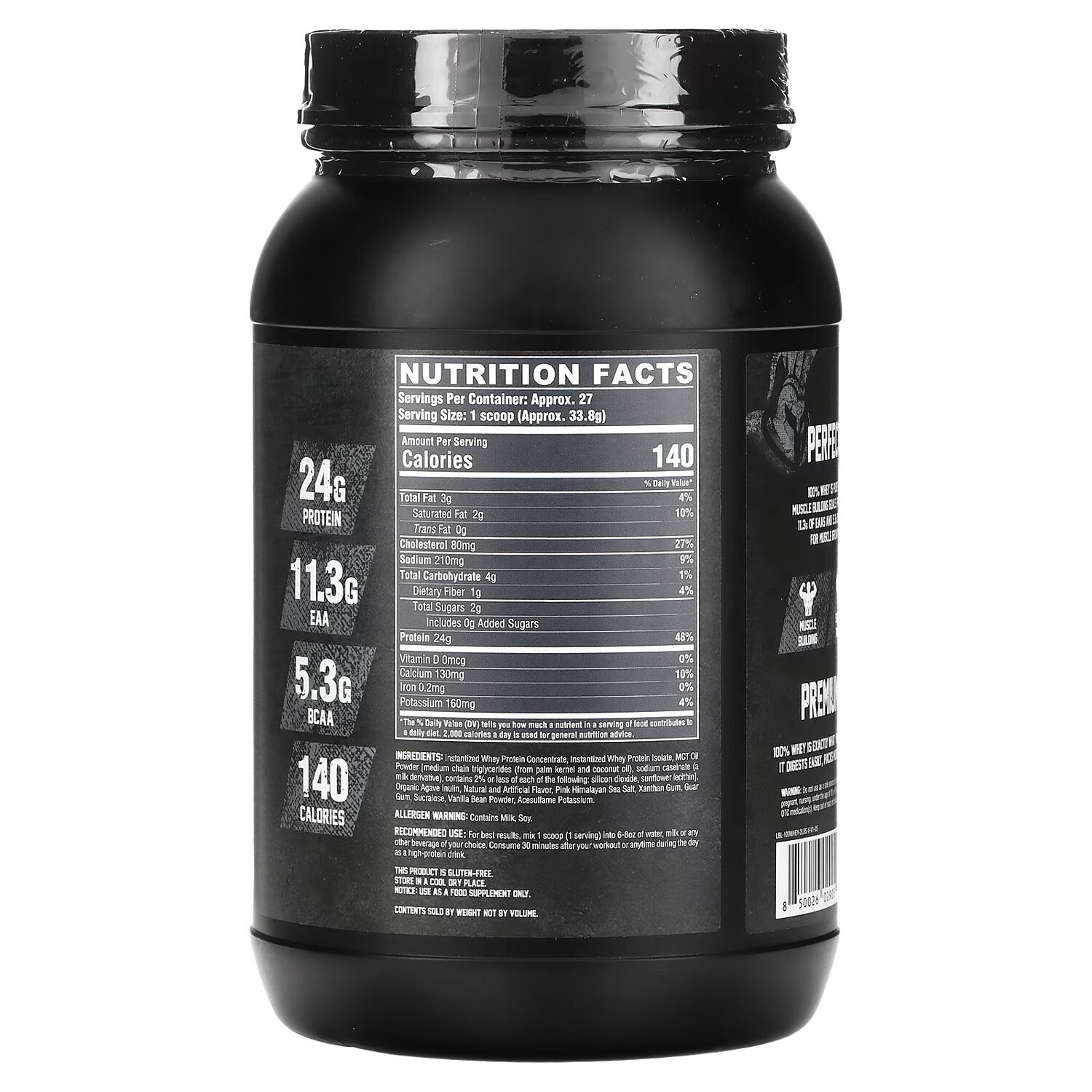 Быстрорастворимый концентрат сывороточного протеина, инстантизированный изолят сывороточного протеина, порошок масла mct [среднецепочечные триглицериды (из пальмовых ядер и кокосового масла), казеинат натрия (производное от молока), содержит не более 2% каждого из следующих веществ: диоксид кремния, лецитин подсолнечника), органический инулин агавы, натуральные и искусственные ароматизаторы, розовая гималайская соль, ксантановая камедь, гуаровая камедь, сукралоза, порошок из стручков ванили, ацесульфам калия.