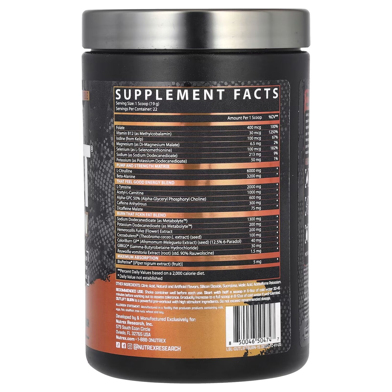 OUTLIFT Burn содержит 1500 мг Metabolyte — продукта, ускоряющего обмен веществ, а также усовершенствованную формулу, включающую самые передовые соединения для сжигания жира на рынке. OUTLIFT Burn содержит сжигающую жир матрицу, не имеющую себе равных среди всех предтренировочных комплексов.