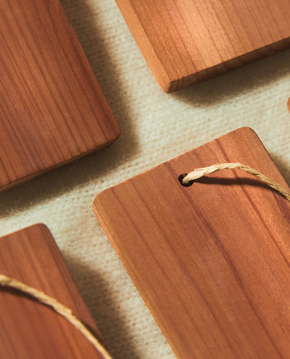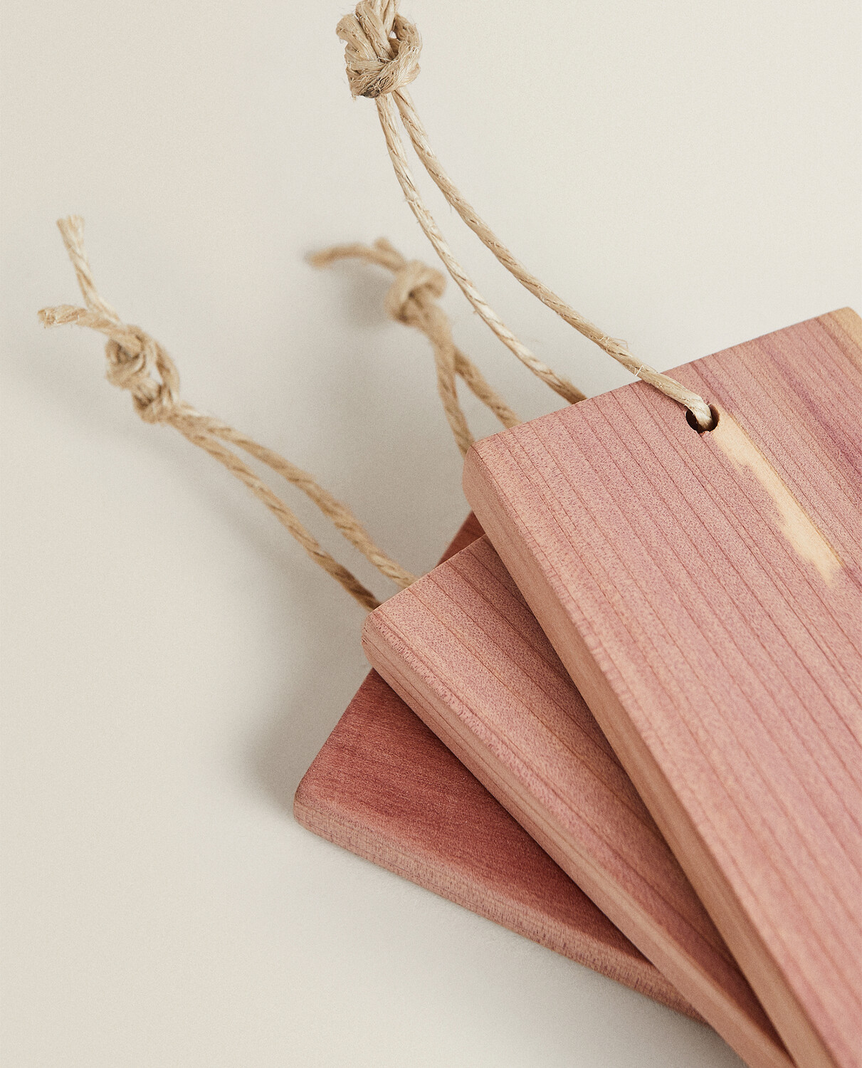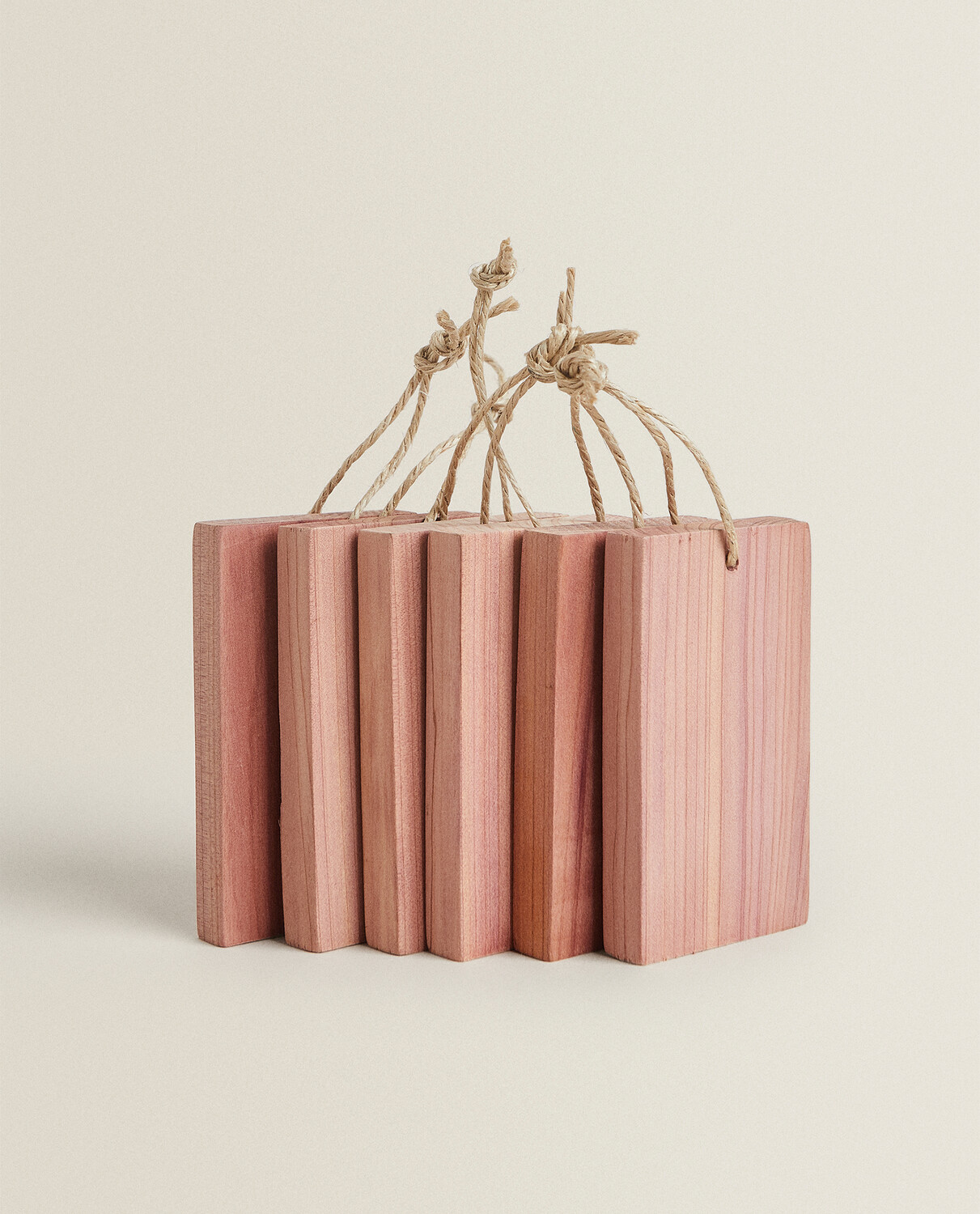 Блоки из древесины красного кедра с джутовой веревкой для подвешивания, которые можно разместить в шкафах и ящиках для поглощения влаги и устранения неприятных запахов.