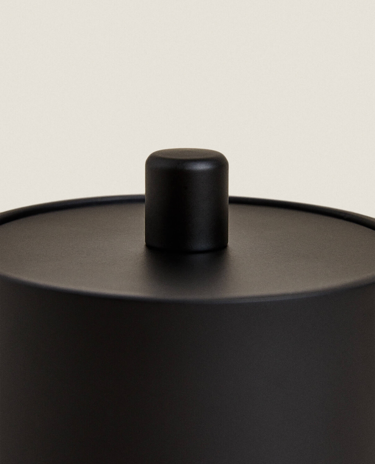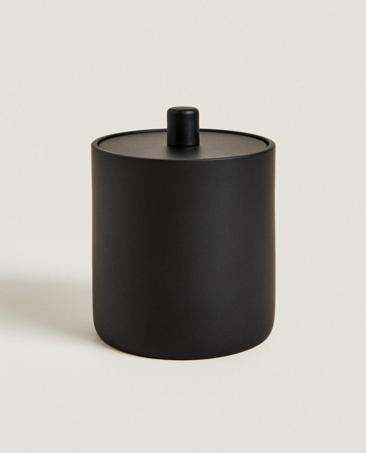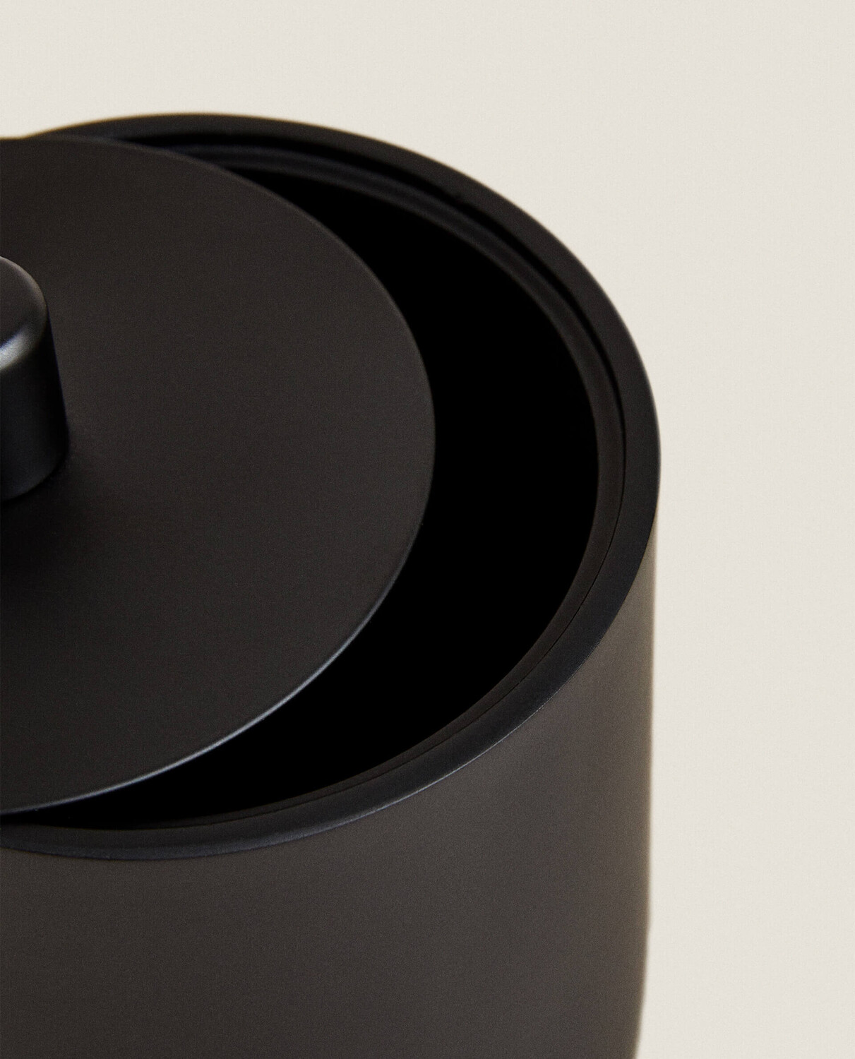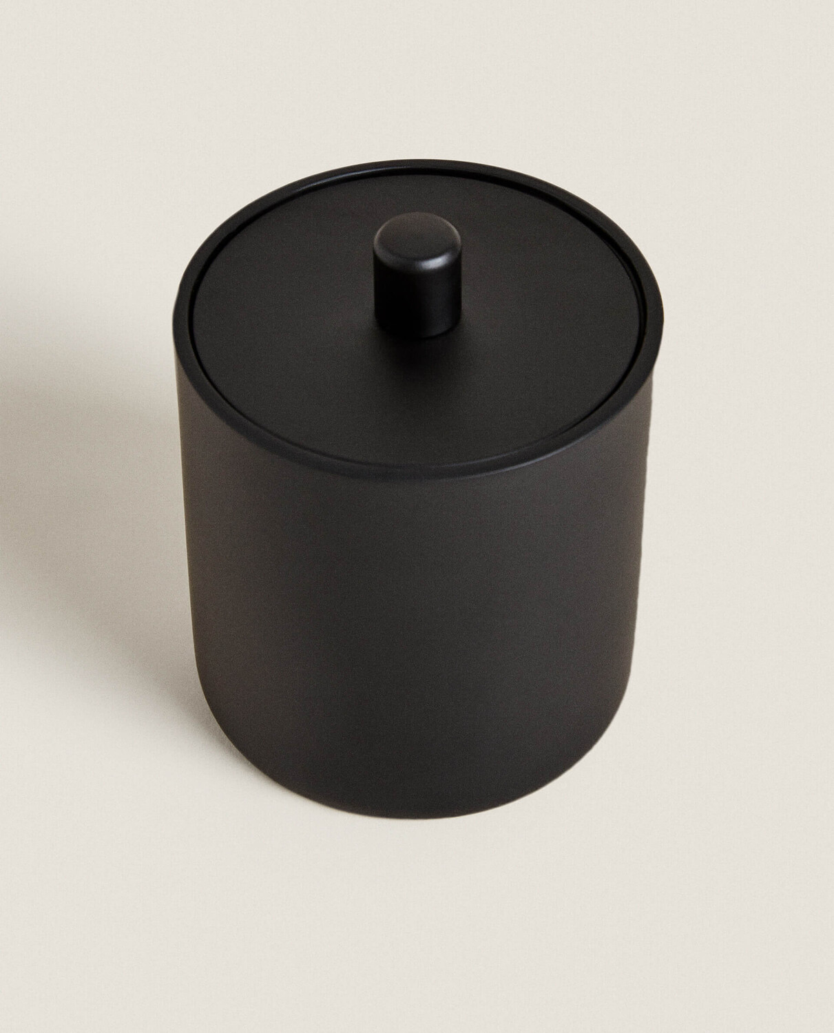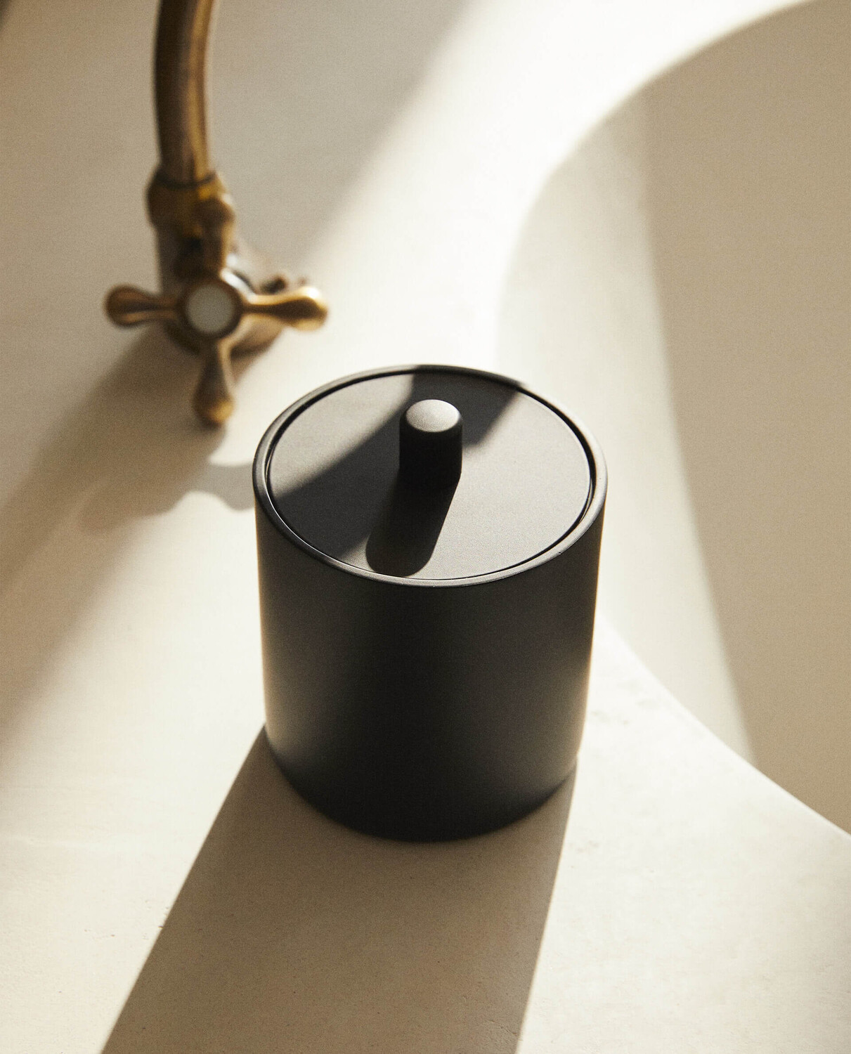 Цилиндрическая банка для хранения в ванной комнате из черной смолы с металлической крышкой.