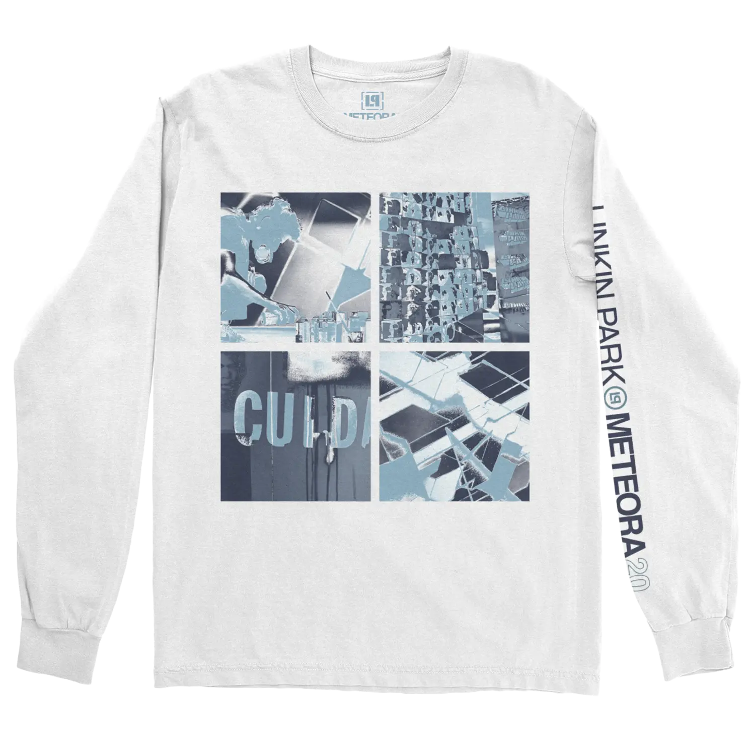 Белое боди с длинным рукавом с коллекцией графики Meteora в синих тонах спереди и логотипом «Linkin Park Meteora 20» на левом рукаве.