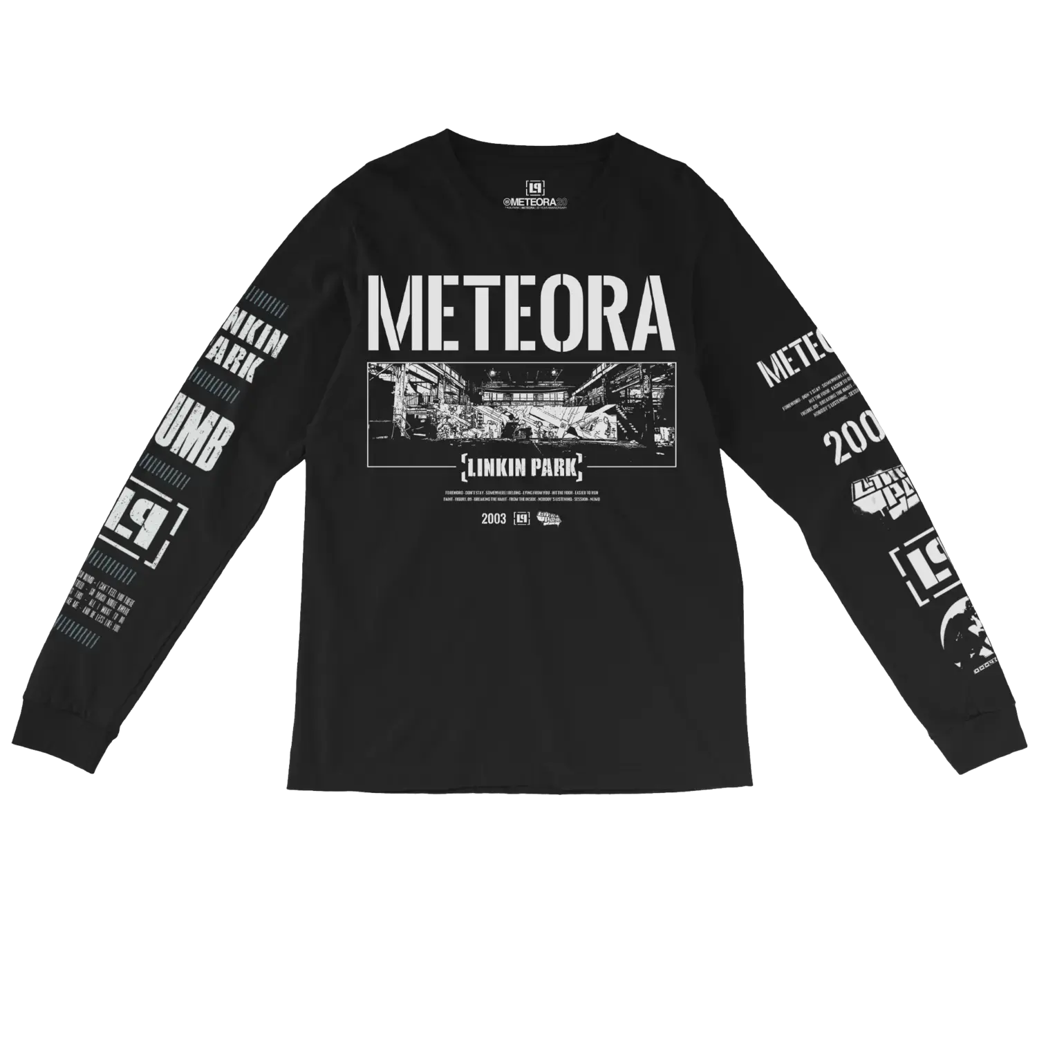 Черное боди с длинными рукавами, на передней части и рукавах которого изображен арт-объект Meteora 20th Anniversary.