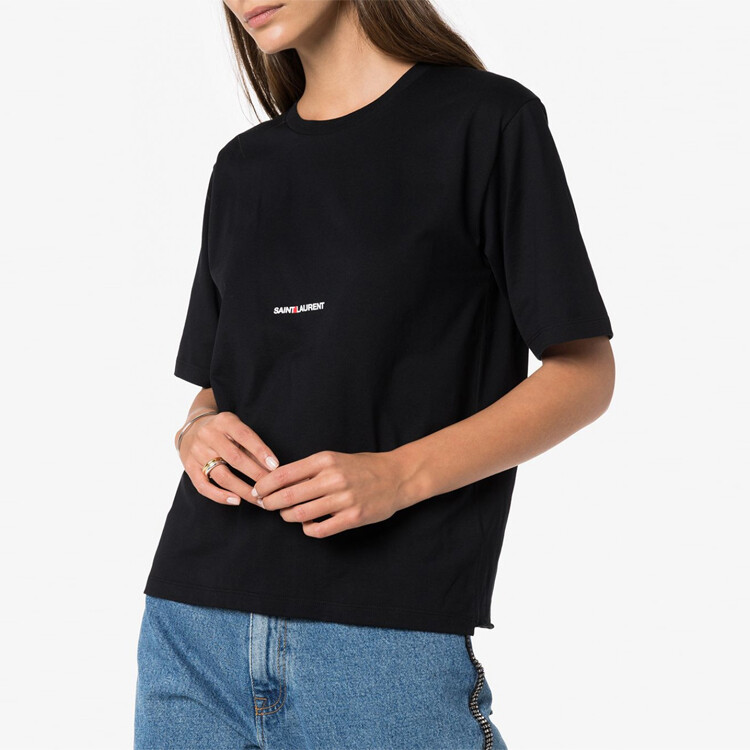 Женская футболка от легендарного французского дома моды Saint Laurent — стильная базовая модель из высококачественного хлопкового джерси с классическим круглым вырезом и короткими рукавами, которая благодаря удобной посадке и мягкой текстуре обеспечивает комфорт на каждый день, а лаконичный дизайн с фирменными деталями подчеркивает премиальный характер и делает ее универсальным элементом гардероба.